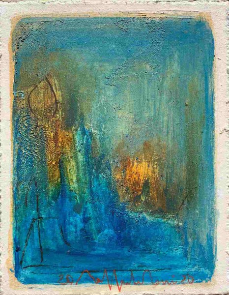 Raffaele Rossi, Cielo è il titolo delle opere realizzate con la tecnica dell’affresco, pigmenti naturali, e ossidi. L’artista dipinge immagini eteree che affiorano da paesaggi onirici. Figure che spesso appaiono librare leggere nel cielo senza una meta ben definita.