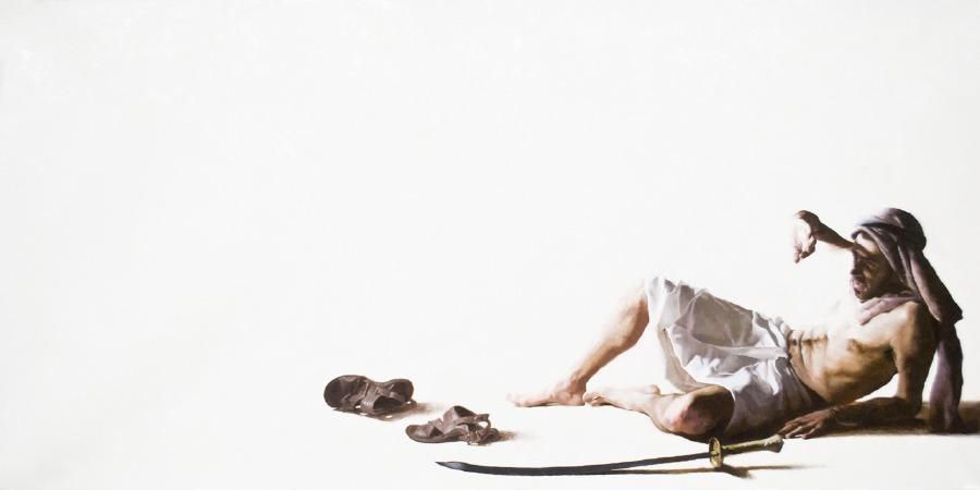 Le opere in mostra fanno parte di un ciclo dedicato a soggetti biblici e mitologici e sono tese tra la profonda ricerca di realismo che caratterizza le figure ed il minimalismo dello spazio all’interno della tela, permeata di una luce intensa che porta a forzare i limiti sensoriali tra il visivo ed il tattile. All’interno di questo percorso artistico il concetto di sacro convive e dialoga con il concetto socio antropologico di mito come atto di fondazione della società, della cultura e dell’ordine razionale delle cose del mondo: nel mito, così come nella narrazione biblica, norme e precetti sociali trovano una propria origine, ammantandosi di un valore altro. La narrazione mitica è quindi una trasposizione, mediata dalla presenza del sacro, di istanze sociali, etiche e morali proprie della natura umana.