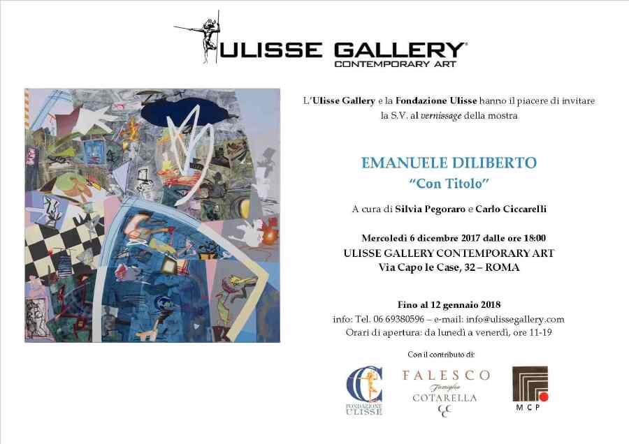 Mercoledì 6 dicembre 2017, alle ore 18, la Ulisse Gallery Contemporary Art inaugurerà, nella prestigiosa sede di Via Capo le Case 32 in Roma, la mostra EMANUELE DILIBERTO – “Con titolo” – Opere recenti (a cura di Silvia Pegoraro e Carlo Ciccarelli). La mostra, realizzata con il sostegno della Fondazione Ulisse e dell’azienda MCP, resterà allestita sino al 12 gennaio 2018. Si tratta di una ventina di dipinti di grandi dimensioni, recenti e inediti, dell’artista palermitano, a lungo vissuto a New York, dove ha frequentato l'ambiente della Factory di Andy Warhol e ha stretto amicizia con Jean-Michel Basquiat, maturando uno stile ricco degli echi della migliore pittura contemporanea astratto-espressionista, ma nello stesso tempo assolutamente originale e sorprendente. Per l’occasione uscirà, a documentare la mostra, un catalogo della collana “Gli Album di Ulisse” (Edizioni Grafiche Turato, a cura di S. Pegoraro).