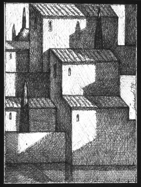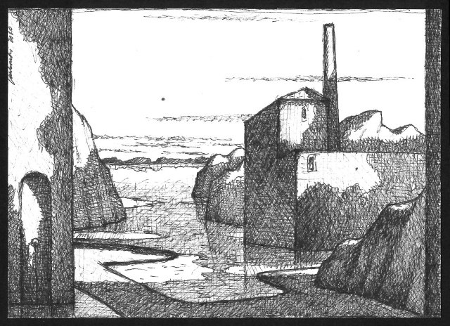 La mostra sull’opera di Enrico Lombardi, con testi critici di Roberto Pagnani a catalogo, consiste in una serie di lavori su carta (incollata su legno). Riferendosi a questa mostra, l’artista così si esprime: “Tutte le opere d’arte autentiche hanno un’anima, un nocciolo segreto originario, un punto di partenza più o meno nascosto, a cui è consegnata la riflessione primaria da cui tutto sorge e si sviluppa. Nel mio lavoro, da sempre, l’anima è costituita dai disegni a penna in bianco e nero. I disegni contengono tutto il processo di riflessione formale che sta alla base delle mie immagini, insieme a tutta la loro ruminazione visionaria. In essi è già deciso quasi tutto di quella che sarà l’opera su tela: composizione, costruzione, luce e ombra. Tranne il colore! Tuttavia, l’ho scritto ancora in passato, a volte, guardando intensamente i disegni, per scegliere quello che trasporterò su altra dimensione e in altra tecnica, sento come un vago, misterioso suggerimento al colore stesso, che poi mi spingerà in una direzione cromatica piuttosto che in un’altra. Per queste ragioni considero i miei disegni a penna opere di capitale importanza nell’economia del mio processo creativo.