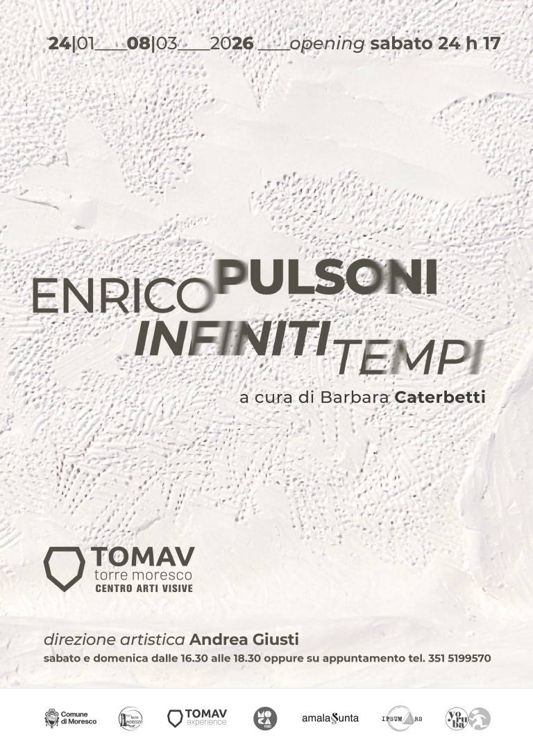 TOMAV EXPERIENCE – TOMAV di Moresco (FM) opening | sabato 24 gennaio 2026, ore 17.00 Il TOMAV EXPERIENCE – Torre di Moresco Centro Arti Visive, con il titolo Infiniti tempi, inaugura sabato 24 gennaio 2026 alle ore 17.00, negli spazi della Torre di Moresco (FM), la personale di Enrico Pulsoni a cura di Barbara Caterbetti.