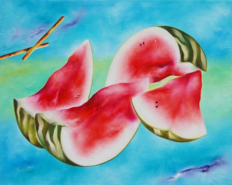 In dipinti raffinati, nei quali l’eleganza dinamica delle forme si unisce alla delicatezza delle sfumature, Riccardo Corti (Firenze, 1952) propone i suoi soggetti prediletti: esili pini marittimi, policromi agrumi in sezione, sensuali angurie e bastoncini sospesi nel vuoto. Gli oli di Corti, dalla spiccata valenza simbolica, creano un gioco testuale di notevole pregio stilistico, nel contesto di una pittura di sintesi, volta a indagare il sensibile con profondità e lirismo.