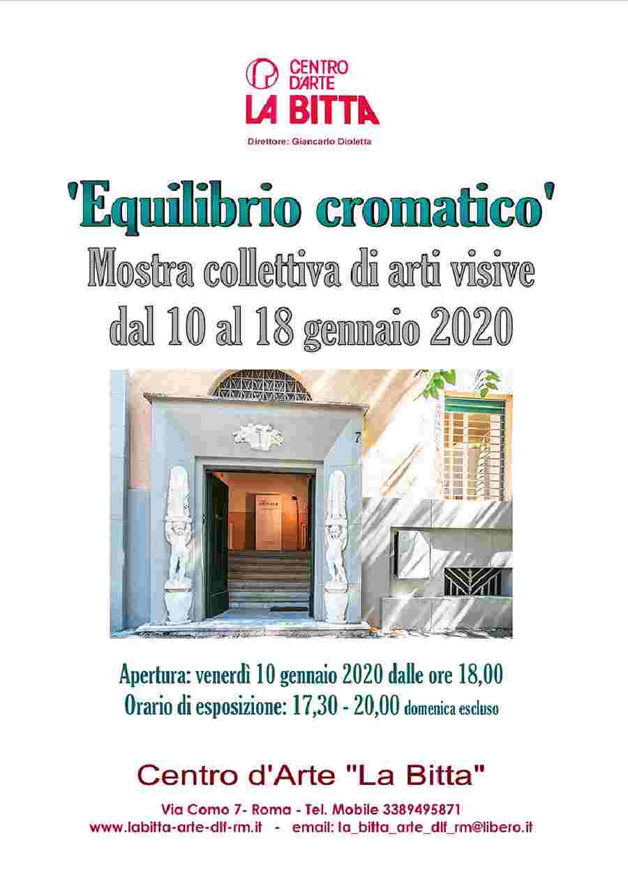 Con la mostra collettiva di arti visive " Equilibrio cromatico" si vuole mettere in evidenza l'equilibrio in termini di cromatismi che si rileva in un’opera. L’effetto che si ha è quello della gradevolezza visiva dove gli oggetti abbiano tonalità bilanciate in base alla posizione che occupano: il tutto per dar vita ad una corretta composizione dell’opera stessa. In quest'occasione si darà ampia scelta all'artista che vorrà esporre le proprie opere pittoriche, scultoree e fotografiche.