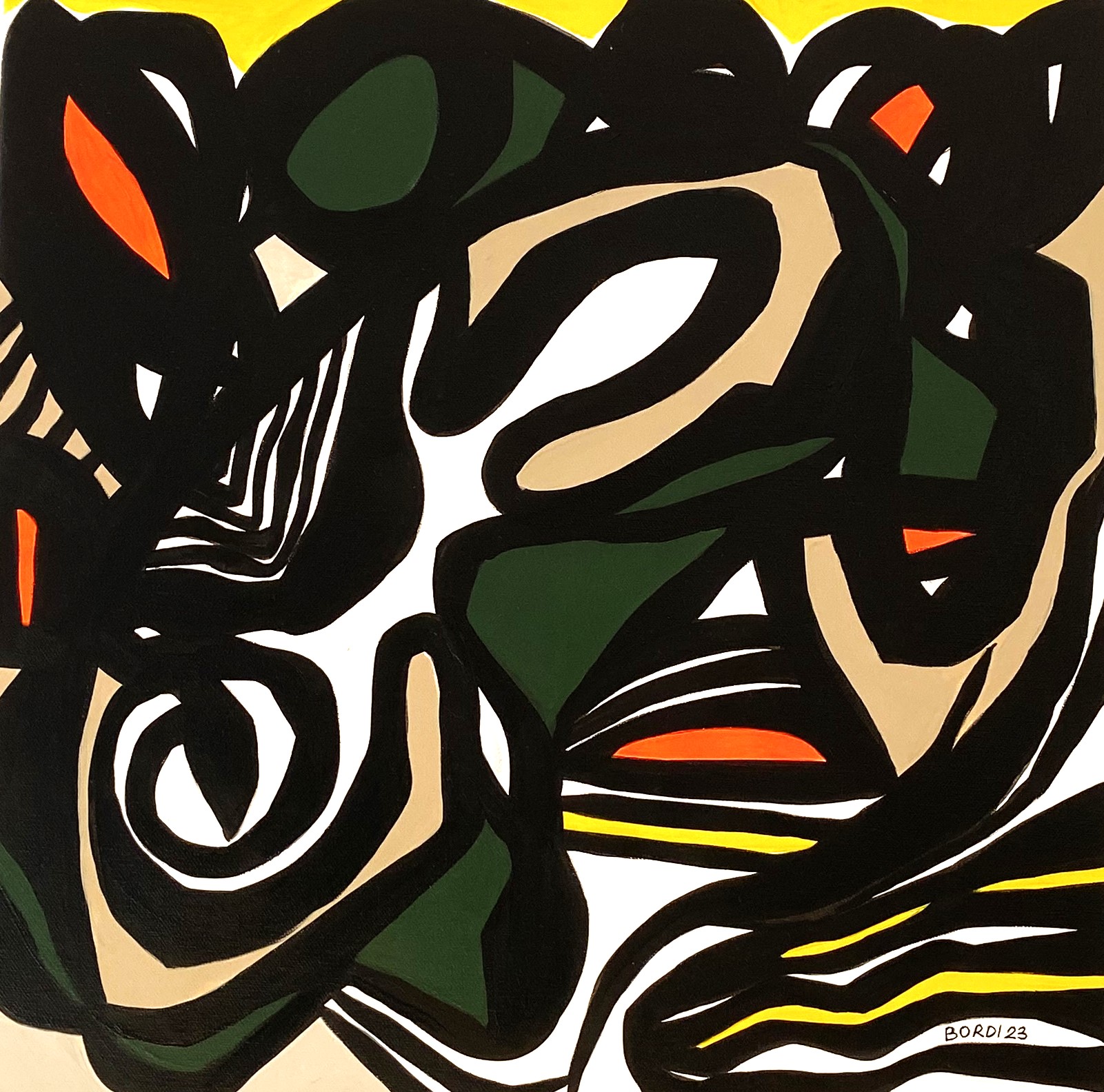 Bordignon sposta l’attenzione sulla superficie strutturata: per darle concretezza e vitalità, l’artista immette sulla tela degli elementi sferici, dando rilievo e dinamica alla superficie. L’articolazione delle superfici nello spazio è indagata attraverso pennellate con estensione superiore e laterale.