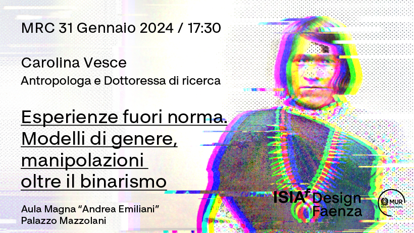 Mercoledì 31 gennaio alle ore 17.30, l'ISIA di Faenza ospita la conferenza Esperienze fuori norma. Modelli di genere, manipolazioni oltre il binarismo dell'antropologa Carolina Vesce, moderata dal Prof. Ivan Severi.
