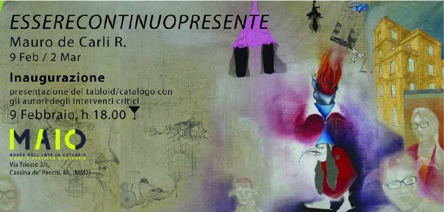 L’artista Mauro de Carli R. (1980) presenta la sua più recente ricerca artistica con il progetto ESSERECONTINUOPRESENTE attraversando con le sue opere i tre piani del suggestivo torrione seicentesco sede del MAiO - Museo dell’Arte in Ostaggio e delle grafiche visionarie, situato in Via Trieste 3/c a Cassina de’ Pecchi, alle porte di Milano. La mostra, che verrà inaugurata il 9 febbraio alle ore 18, sarà visitabile fino al 2 Marzo.