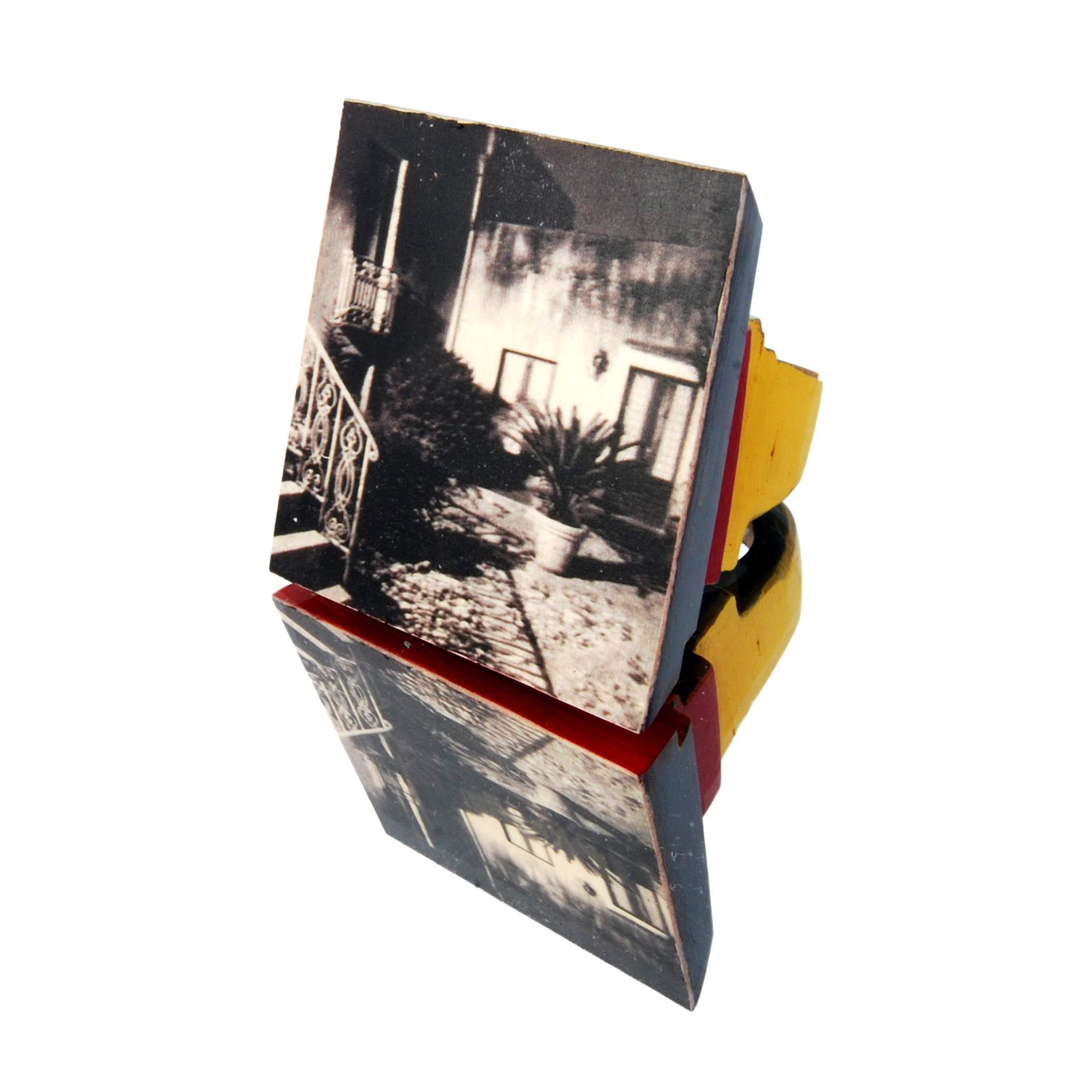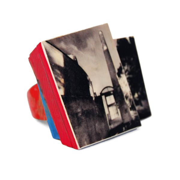 La collaborazione tra Fabrizio Bonvicini, maestro scultore di architetture indossabili e Marina Giannobi, fotografa di percezioni notturne, porta alla realizzazione di una serie di anelli in legno con inserti fotografici. Queste piccole sculture restituiscono uno sguardo sul mondo con geometrie architettoniche, colori che ne sottolineano i volumi e immagini in bianco e nero misteriose ed evocative. Forme come rocce islandesi, colori come templi indù, immagini indefinite come la notte, ci trasportano nei più remoti luoghi.