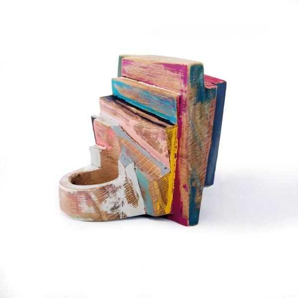 La genesi è un pezzo di legno grezzo ed informe. Bonvicini utilizza tecniche e strumenti diversi a seconda delle fasi di lavorazione e del tipo di obbiettivo: la motosega per ridurre le dimensioni, lo scalpello, le frese per le parti più minute, le seghe giapponesi per ottenere parti geometriche e tonnellate di carta abrasiva … Tutto il legno utilizzato da Bonvicini proviene da recuperi.
