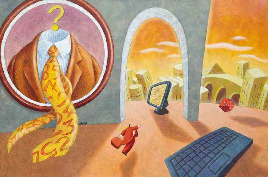 Valente Taddei (Viareggio, 1964) realizza dipinti a olio e china dal taglio narrativo, nei quali un minuscolo individuo si ritrova in contesti al limite del paradosso, sospeso in tempi e spazi indefiniti. La linea tracciata dall’artista asseconda le peripezie del suo personaggio, temerario ma insicuro, solitaria presenza in un cosmo dagli equilibri precari, icona della fragilità umana in bilico tra sogno e inconscio.
