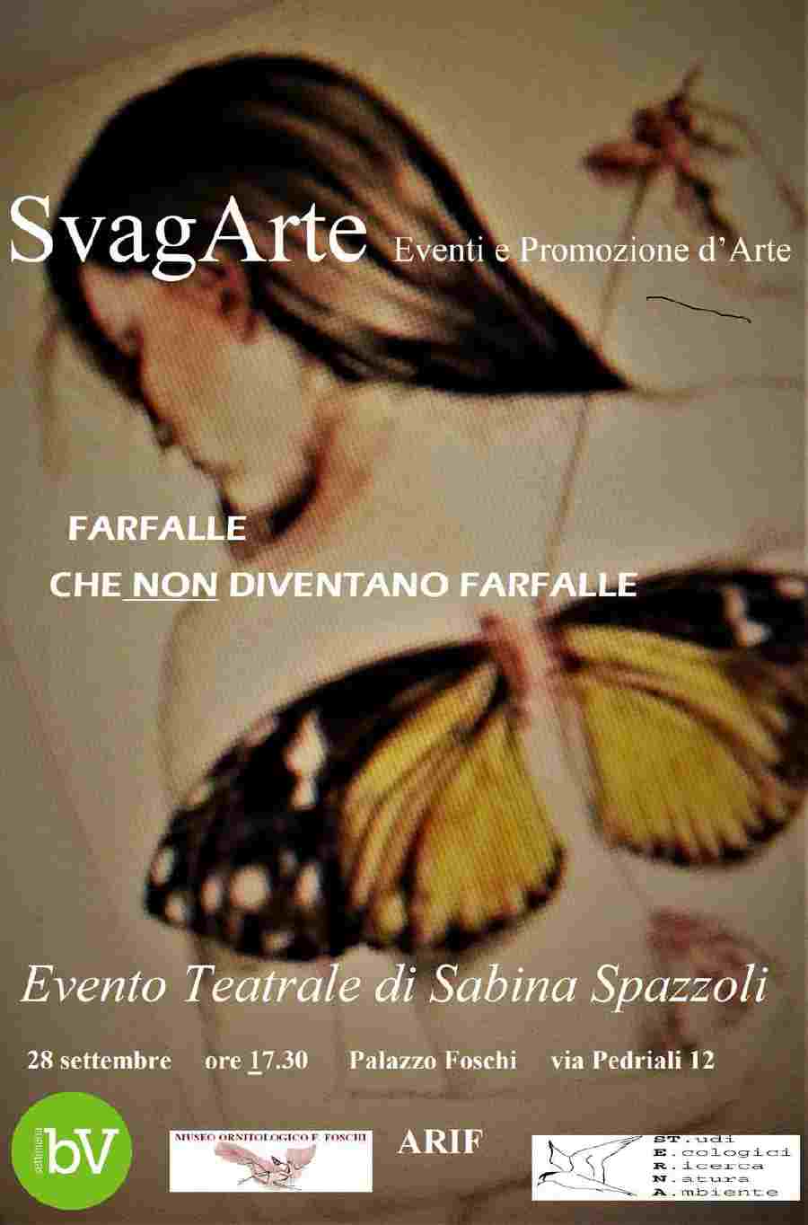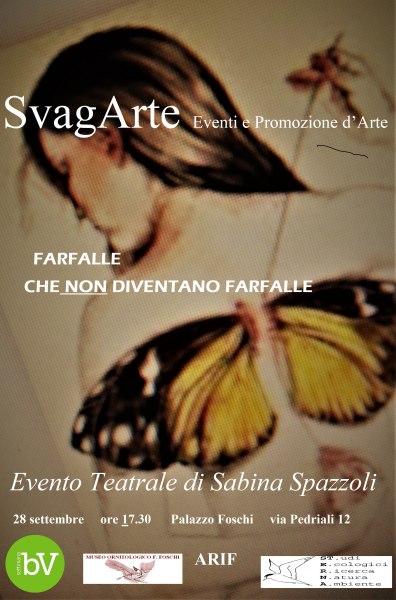 FARFALLE CHE NON DIVENTANO FARFALLE Sabato 28 settembre ore 17,30, Palazzo Foschi in via Pedriali 12, Forlì per B.V. “Farfalle che non diventano farfalle” a cura dell’Associazione Svagarte in sinergia con Museo Ornitologico “F. Foschi”, ARIF, STERNA. Tra le verdi quinte di Palazzo Foschi Numai, si terrà l’evento teatrale, su testo inedito dell’attrice Sabina Spazzoli, da lei recitato e accompagnato con sottofondo di musicale. All’inizio del xx secolo, in campagna e in città non esisteva famiglia che non avesse allevamento di bachi da seta. Seta che aveva a Meldola un mercato di eccellenza. La giovane che alleva bachi con la fantasia cerca di uscire dal suo bozzolo di stanche quotidianità che si intrecciano inconsapevolmente con i grandi eventi del secolo breve. Sabina Spazzoli tesse il suo testo di piccole fragilità esistenziali, preziose per ricostruire pezzi di vita che abitano nella memoria di tutti noi. Sabina Spazzoli presenta un testo inedito sulla quotidianità della coltivazione domestica del baco da seta, un unicum sul territorio e la sua storia. Ingresso libero.