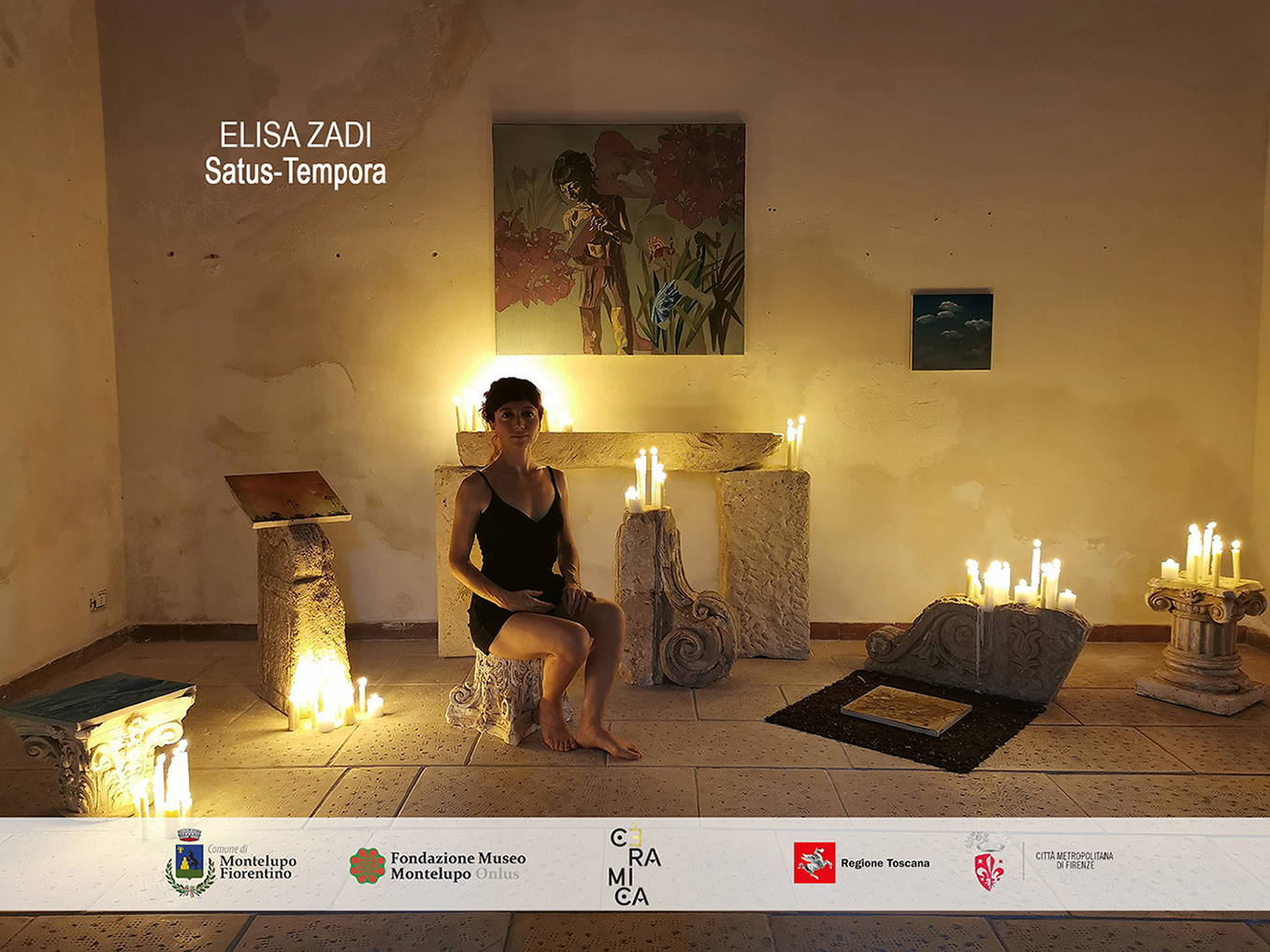 Il fuoco, legato al mistero che si rivela dal mito della caverna di Platone, alla fascinazione della scoperta della luce che illumina l’oscurità, ma anche al sublime che seduce e allo stesso tempo sconfina nel pericolo di distruzione. La luce delle candele rimandano a una dimensione ancestrale e sacra che Elisa Zadi ha esplorato attraverso questa installazione pittorica site specific. L’artista utilizza infatti degli elementi trovati in loco per astrarre il senso archetipico degli elementi naturali e avvalorare la sua idea di legame imprescindibile e instabile fra uomo e natura: Satus-Tempora, simboleggia il trascorrere inesorabile del tempo, che consuma, brucia, ma anche illumina. L'opera si presenta come una sorta di percorso simbolico che può essere contemplato in una visione immersiva all'interno della suggestiva Fornace. L’installazione presenta una serie di opere pittoriche raffiguranti gli elementi naturali e l‘uomo simbolicamente rappresentato dall’autoritratto dell’artista.
