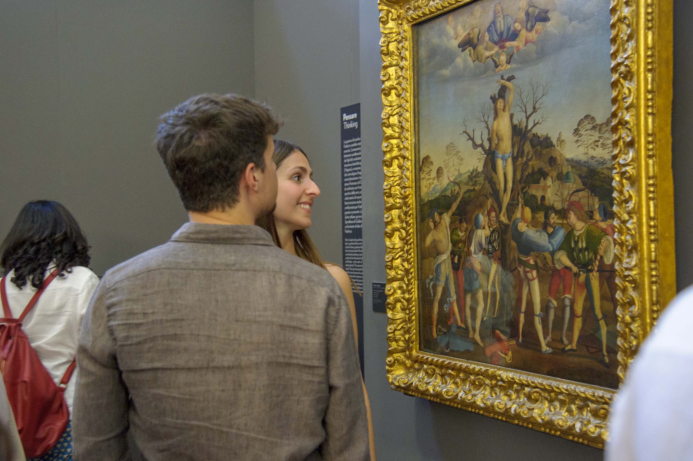 Ogni sede della mostra ospita un ambito peculiare con più sezioni che abbracciano nella totalità la figura di Federico da Montefeltro e permettono di scoprire il suo rapporto con Gubbio. A Palazzo Ducale è raccontata la vita di corte, le vicende costruttive del palazzo, le conoscenze e frequentazioni del duca, le arti a Gubbio nel periodo feltresco. Interessante la sezione dedicata alla musica, con gli strumenti rappresentati nelle tarsie dello Studiolo. Palazzo dei Consoli intreccia il tema delle “armi” e delle “lettere”: una prima sezione è dedicata al fare, guardare e pensare la guerra all’epoca di Federico da Montefeltro e un’altra alla cultura umanistica del duca. Pregevole la Battaglia di Pidna attribuita al Verrocchio o il grandioso Martirio di San Sebastiano del Signorelli. Al Museo Diocesano, infine, l’esposizione è dedicata alle scienze matematiche, astronomiche e astrologiche, particolarmente care al duca e fonti della sua formazione culturale e spirituale.