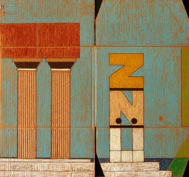 Una colonna e l’altra di un’impressionante torre per aste della N; spariti il frontone ascensionale e il tetto per copertura, rimane solo una trabeazione che si tiene da sé, il tempio senza tetto non fu, non è stato e non sarà d’ostacolo. Mancano i piombi, erba e fiori possono crescere, e il cielo azzurro si potrà vedere. Dal capitello un filo a piombo che oscilla come una mano nella mano di corpi in cammino. N di Nietzsche, Z di Zarathustra, secondo i punti di vista. Una colonna dà inizio all’iniziale, con una colonna essa termina. Fra le colonne un filo a piombo che oscilla a collegarle, nel tempo di un attimo e di tutta una vita: l’uno e l’altra non si escludono, nella legge dell’eterno ritorno all’unisono quindi più improvvisazioni coincidono.