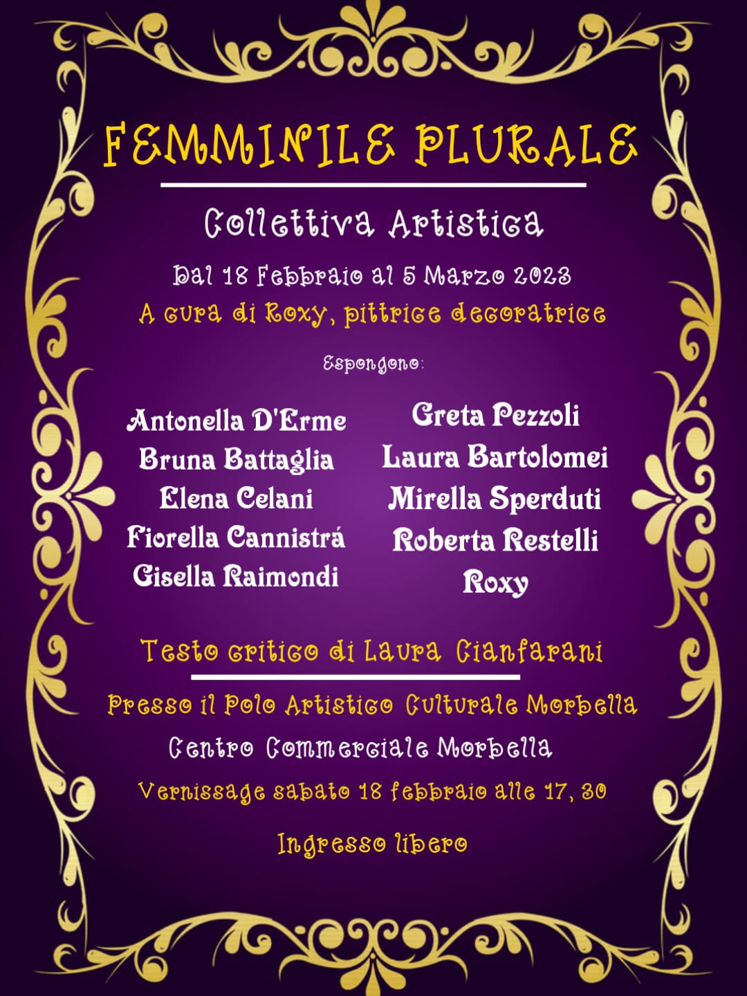 “Molto è stato scritto sulla cosiddetta “arte al femminile” e diverse mostre sono state organizzate pensando a cosa voglia dire fare arte per una donna. E’ vero che in passato per le donne non era affatto facile dedicarsi all’arte ed è altrettanto vero che sui manuali di storia dell’arte i nomi delle artiste sono esigui, ma questa situazione sta cambiando, sia perché sono mutati i tempi e oggi le donne possono fare dell’arte la propria vocazione come per qualsiasi altra attività, sia perché gli studi più recenti stanno rendendo giustizia ad artiste per troppo tempo dimenticate, prime tra tutte Artemisia Gentileschi e Sofonisba Anguissola. In virtù di questa nuova situazione, “Femminile plurale” non vuole essere un’esposizione di “donne che fanno arte” ma di artiste, rivendicando la parità di genere che viene a verificarsi in virtù dell’arte stessa, che, esaltando l’individualità di ognuno, contemporaneamente ne universalizza il racconto, che si tratti di uomo o donna. A rafforzare quanto detto interviene il fatto che è stato il caso a mettere insieme esclusivamente artiste per questa mostra e non una scelta curatoriale a priori.