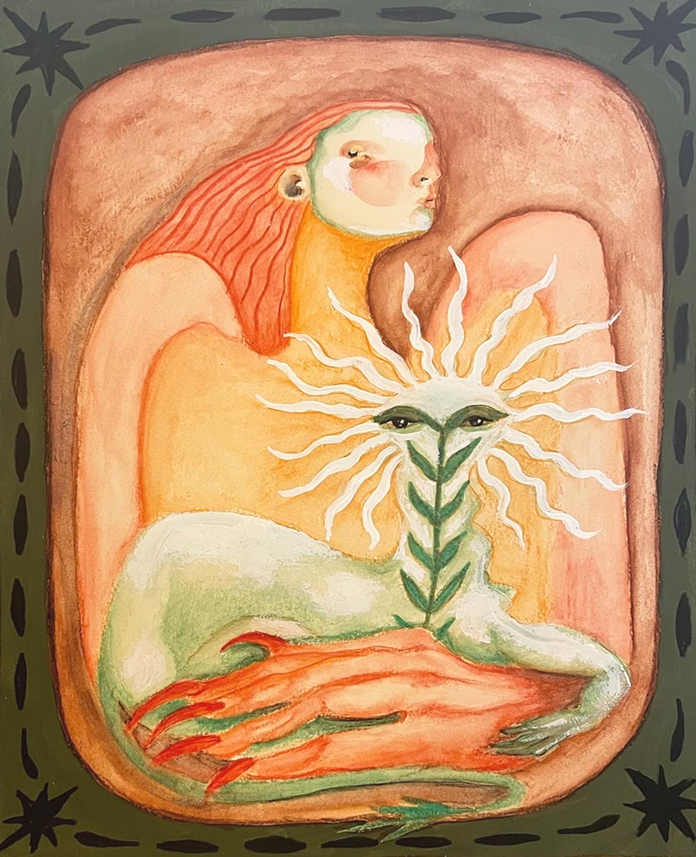 ‘Fiere’ è introdotta da un’opera ammantata di mistero e magia (Le foglie del Male, 2023), che estrinseca il bicefalismo dell’animo femminile, attraverso una fusione panica con la Natura. Oltre la soglia, abnormi figure zoomorfe (serie Focus, 2023) vegliano su un ciclo di opere su carta, ispirate al simbolismo dei tarocchi e degli antichi bestiari medievali.