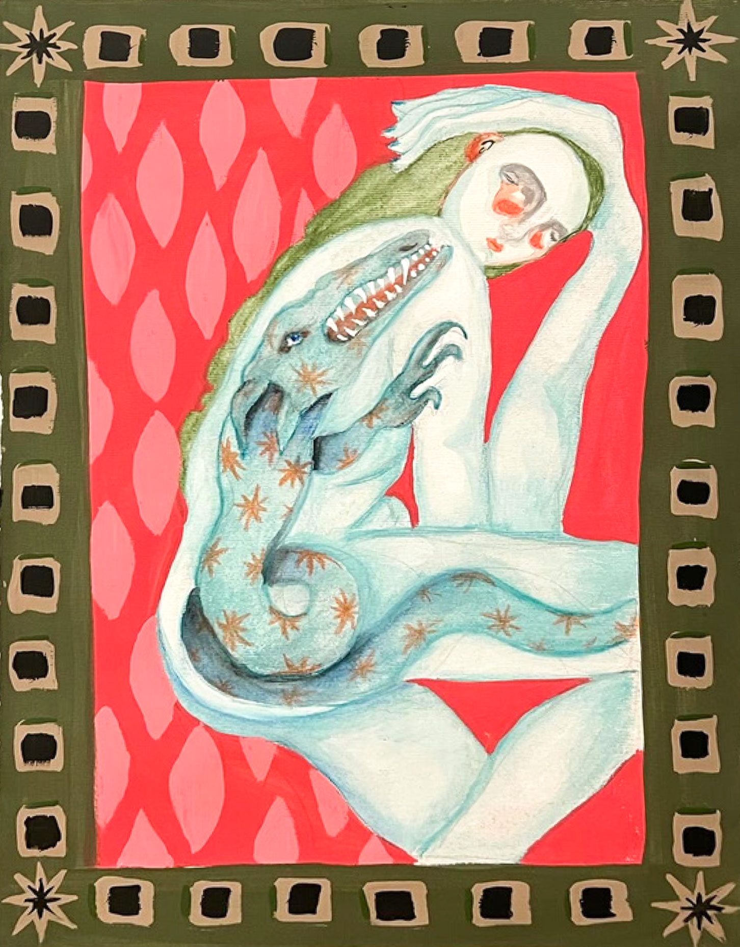 ANDY TREMA - Francesca Mele (Galatina, LE – 1982), vive e lavora a Roma. Nel suo alter ego trova spazio un universo creativo polifonico, in cui le arti visive incontrano la musica. Dopo il diploma all’Accademia di Belle Arti di Lecce, tra il 2006 e il 2012 intraprende la carriera da musicista con la band Lola and the Lovers e poi con il progettosolista Malva. In questo periodo collabora alla produzione di videoclip musicali come costumista, scenografa e videomaker. Femminista convinta, partecipa attivamente alla scena indipendente della capitale e a partire dal 2017 realizza illustrazioni, ceramiche e capi personalizzati, in collaborazione con brand ed etichette sensibili a queste tematiche. In quest’ottica nel 2022 dà vita al progetto This is Pink (Castello Volante, Corigliano d’Otranto – LE) e fonda Make Me, un collettivo di sole illustratrici di cui oggi è curatrice. Nello stesso anno torna alla pittura con nuova ispirazione e avvia una produzione molto intimista, che nel 2023 le apre le porte del Simposio di Pittura nella residenza Lac o Le Mon (Casa Cafausica – San Cesareo, LE). Nel 2024 porta avanti la sua ricerca e prende parte alla collettiva Schiaparelli Pink (Chiostro delle Clarisse di Noci, BA).