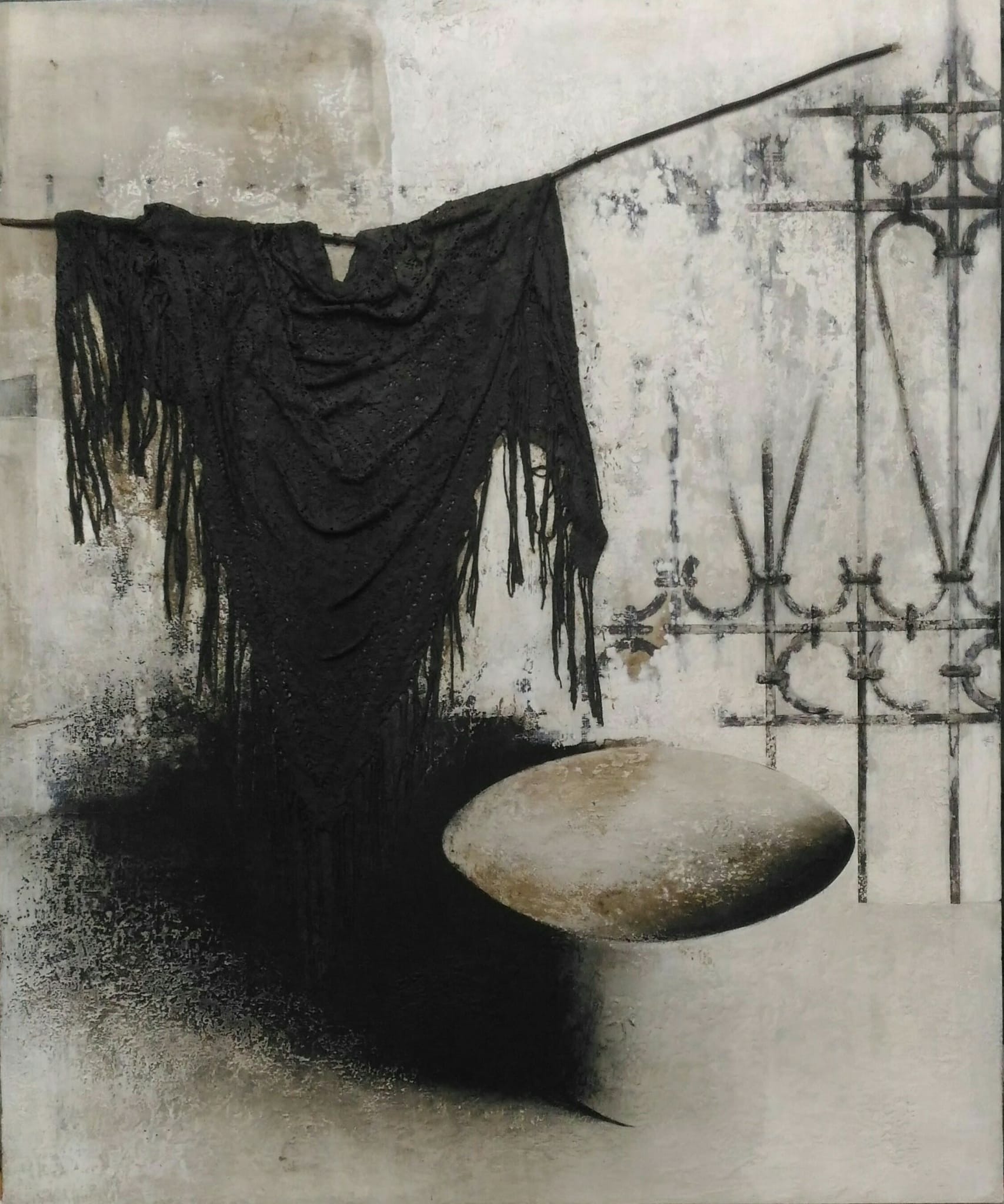 Antonio DE PIETRO, esposto per primo nella galleria Schanzer di Sutri, è presente anche in questa cerchia proprio per quel legame di scambio e reciprocità di cui si parlava in principio. Pittore lirico, si rifà nelle sue creazioni ad una pittura materica, arricchita dall’utilizzo di materiali come ferro e chiodi, per ricondursi al tema della storia e del ricordo. Con Acquasanta accenna ancora a forme del figurativo ma fa trasparire tutta la passione per terre e luoghi del passato, rarefatti e sbiaditi. In Lettere d’amore l’indagine sul senso del tempo e sulla sua inafferrabilità è ancor più evidente, con una lavorazione a tecnica mista che è ricca, densa ma al tempo stesso chiara ed esplicita.