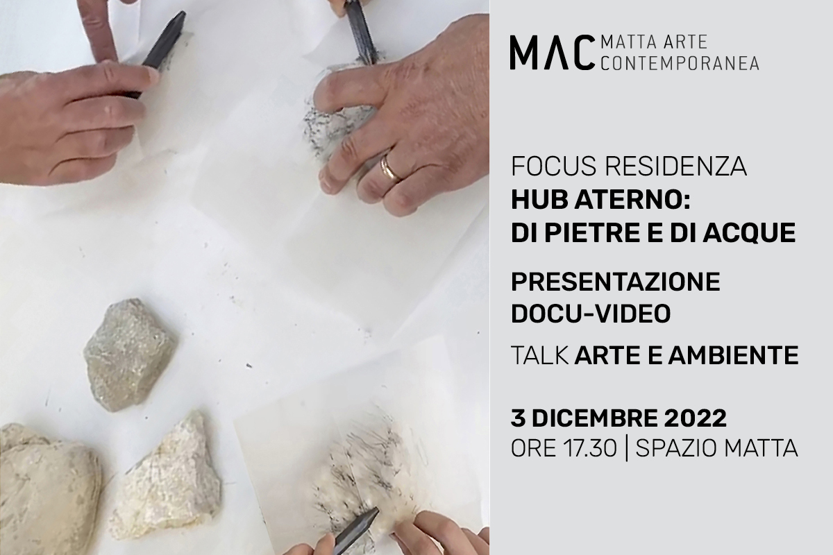 Il 3 dicembre 2022alle ore 17.30Matta Arte Contemporaneapresenterà un focus su Hub Aterno: di pietre e di acque. Durante l’incontro sarà proiettato il docu-videoche racconta le due fasi di svolgimento della residenza, il cui fulcro è stato l’area urbana del fiume Aterno.
