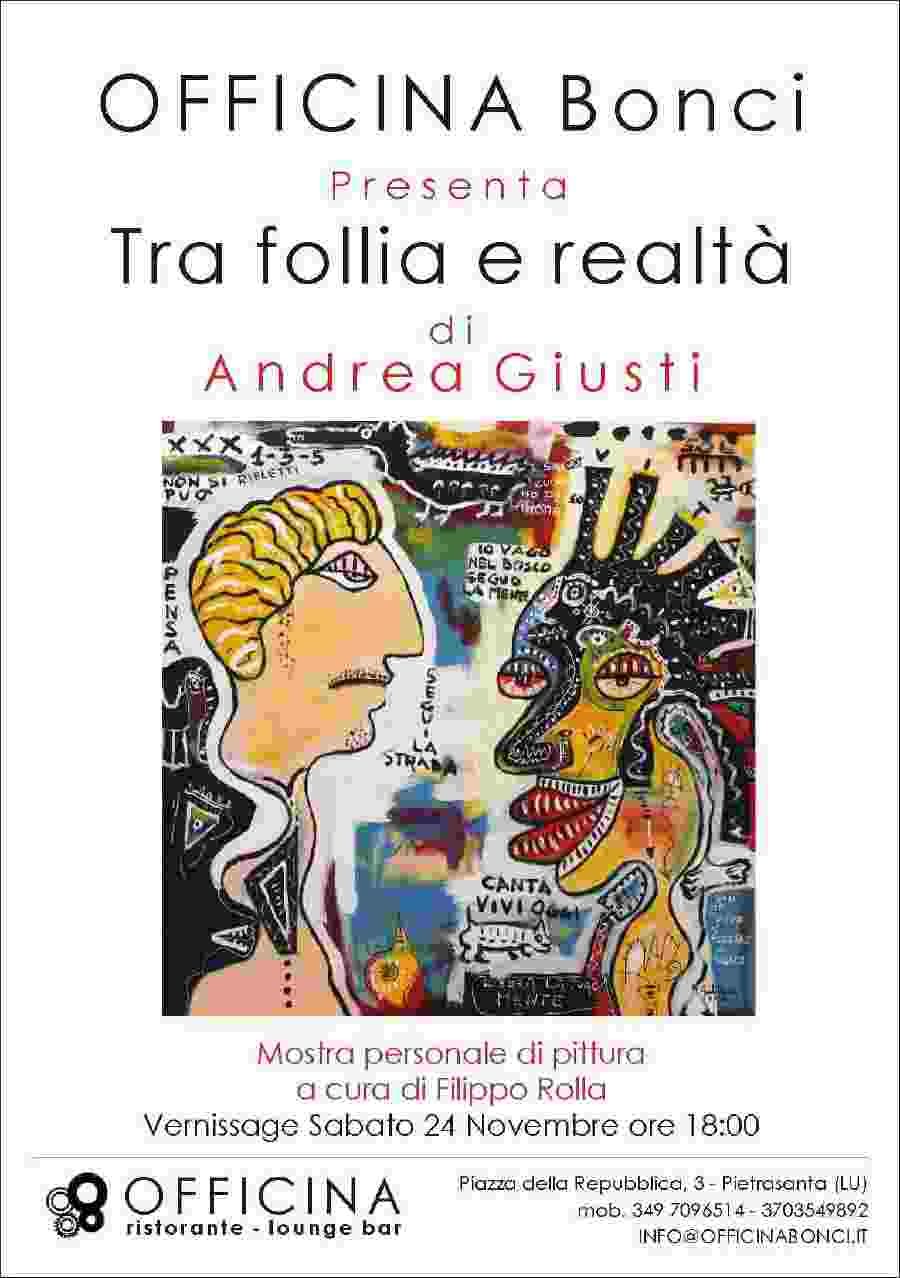La mostra Tra follia e realtà delinea due aspetti formali della ricerca di Andrea Giusti che riguardano il soggetto, dall'astratto si passa al figurativo, ed il supporto, dalla tela al legno, per arrivare al cartoncino.