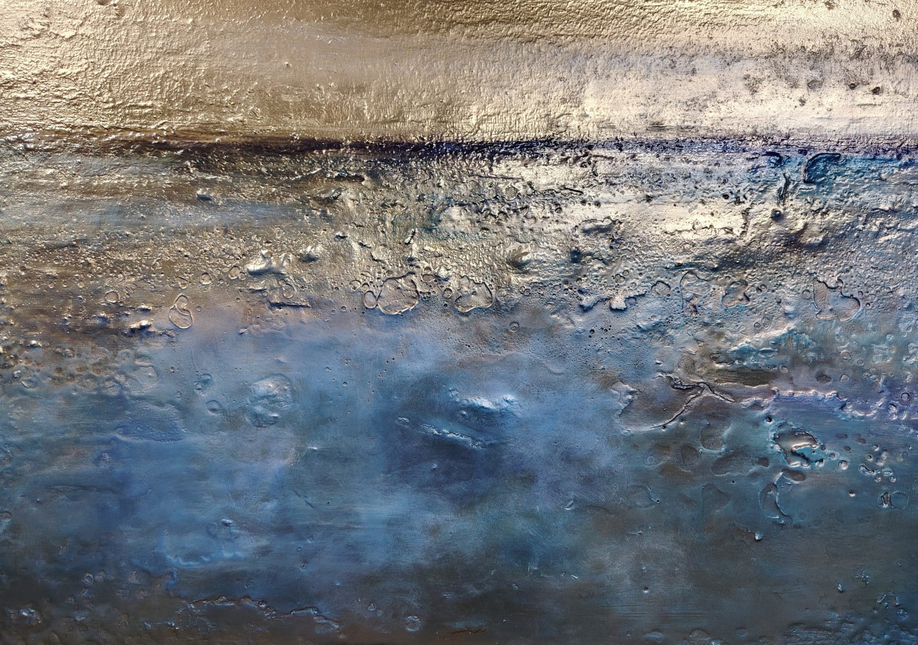 Ben diverso l’approccio della Pratesi, la quale immerge il pubblico in composizioni materiche, dove il colore blu trionfa e ci immerge nelle sue profondità. Nell’opera “La danza dell’acqua” sentiamo il suo scorrere, la profondità degli abissi, ne veniamo quasi inghiottiti. Nella sua arte il colore è una continua trasformazione, fino a diventare materia non solo da guardare, ma da toccare. Non mescola mai in un quadro tanti colori, sceglie una tonalità e gioca sulla sua trasparenza.
