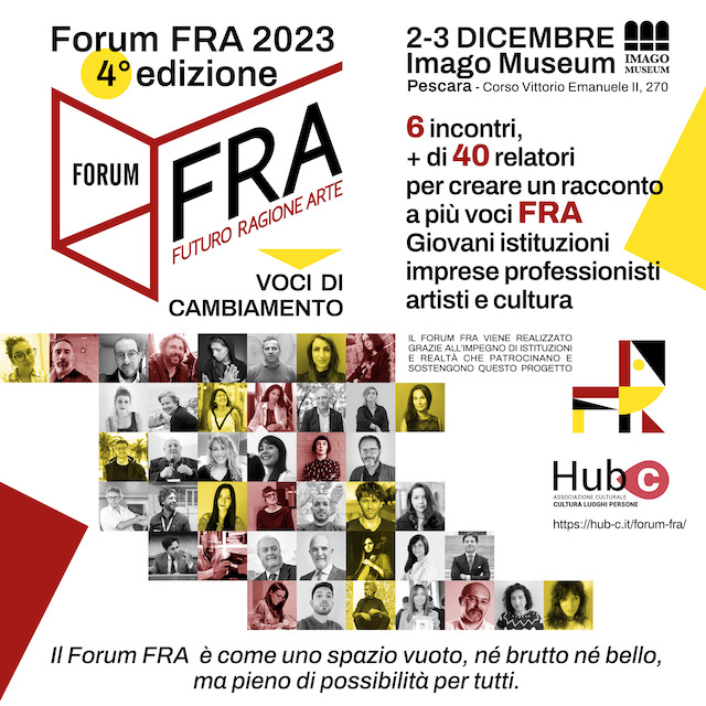 Dal 2 al 3 dicembre torna la quarta edizione del Forum FRA Futuro Ragione Arte presso l’Imago Museum di Pescara. Il Forum non è il solito convegno, va oltre le solite lezioni, saranno due giorni di Agorà aperta a tutte le persone, in particolar modo, alle giovani generazioni, agli artisti, alle istituzioni pubbliche e private, alle imprese e a chi lavora nel terzo settore e sente l’urgenza di rimettere al centro la relazione con l'altro come bisogno primario. Ospiti in conversazione tra loro, provenienze, generi, professioni ed età diverse che si intrecciano sul campo della cultura intesa come fattore produttivo di valore sociale ed economico di un territorio per creare un racconto a più voci su tematiche quali: giovani, istituzioni, impresa, artisti e cultura. Il Forum è un dialogo FRA persone in cui il pubblico è invitato a ripensare al ruolo passivo nel quale viene spesso confinato mediante un confronto diretto che permette a tutti di incrociare i pensieri e crescere insieme.