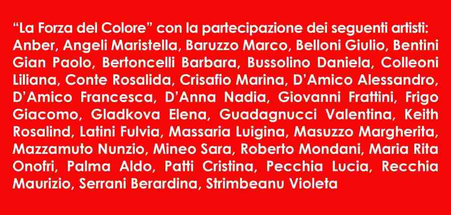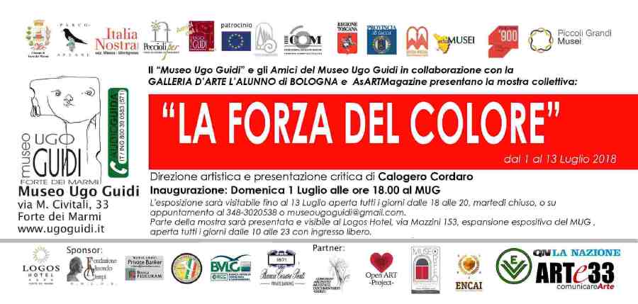 Il Museo Ugo Guidi di Forte dei Marmi in collaborazione con La Galleria d’arte L’ALUNNO di Bologna ospita dall’1 al 13 luglio 2018 la mostra collettiva di arte dal titolo “La Forza del Colore” con la partecipazione dei seguenti artisti: Anber, Angeli Maristella, Baruzzo Marco, Belloni Giulio, Bentini Gian Paolo, Bertoncelli Barbara, Bussolino Daniela, Colleoni Liliana, Conte Rosalida, Crisafio Marina, D’Amico Alessandro, D’Amico Francesca, D’Anna Nadia, Giovanni Frattini, Frigo Giacomo, Gladkova Elena, Guadagnucci Valentina, Keith Rosalind, Latini Fulvia, Massaria Luigina, Masuzzo Margherita, Mazzamuto Nunzio, Mineo Sara, Roberto Mondani, Maria Rita Onofri, Palma Aldo, Patti Cristina, Pecchia Lucia, Recchia Maurizio, Serrani Berardina, Strimbeanu Violeta .