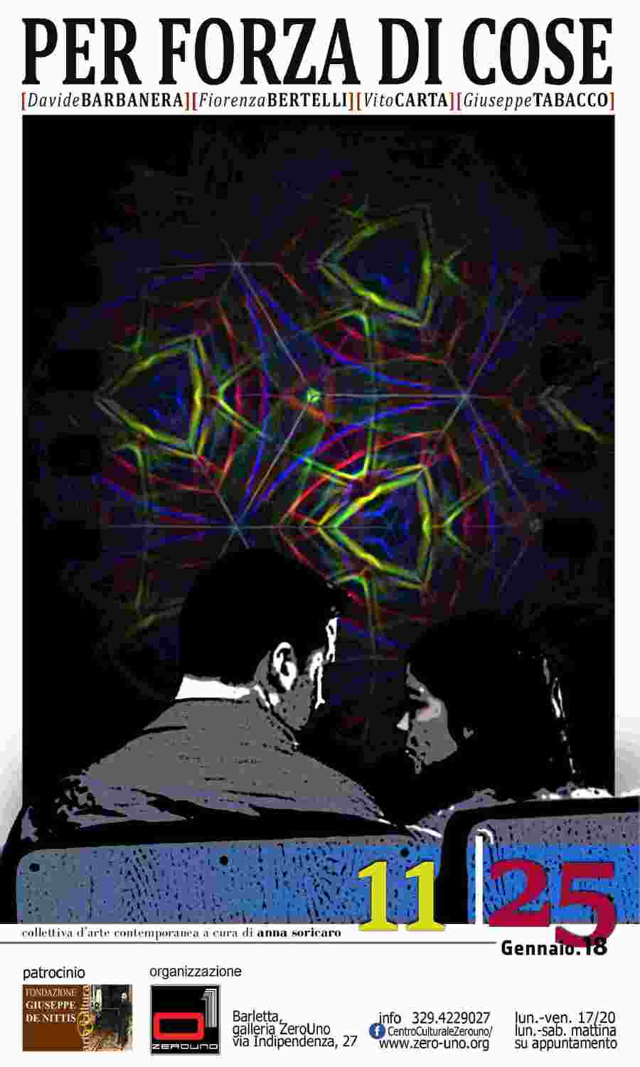 Una citazione essenziale lascia riflettere sull’importanza delle cose e ben si abbina alle opere d’arte dalla semplicità disarmante, che hanno bisogno di apparire con la stessa naturalezza e forza con cui sono state create. Ogni cosa ha un colore, eppure nelle opere d’arte c’è sempre un colore nascosto, quello che resta nella mente di chi crea e quello ‘speciale’ che solo l’osservatore attento sa individuare. Un film recente che tratta di un pubblicitario in carriera innamorato di una donna non vedente molto combattiva, ispira la prima esposizione del triennio dedicato al binomio arte-cinema. Per questo evento sono state selezionate opere dalla semplicità disarmante, essenziali, figurative ed astratte, pittura ed arte digitale che godono di grandezza imparagonabile perché ognuna predilige tecnica e tratti sorprendenti. Davide Barbanera, Fiorenza Bertelli, Vito Carta, Giuseppe Tabacco sono i quattro artisti prescelti che con tratti essenziali e purezza estetica hanno saputo ’per forza di cose’ dare un colore a tutto riuscendo a mostrare, anche a chi non sa vedere, tutto ciò che ogni tratto sottende. Sono stati individuati quattro artisti volutamente differenti che tra astrazione e arte digitale sono legati dalla semplicità del tratto riuscendo ad emergere con essenzialità. Il titolo è scelto dalla stessa citazione e vuole essere un riferimento alla naturalità dell’arte che ‘pr forza di cose’ riesce sempre a sorprendere.