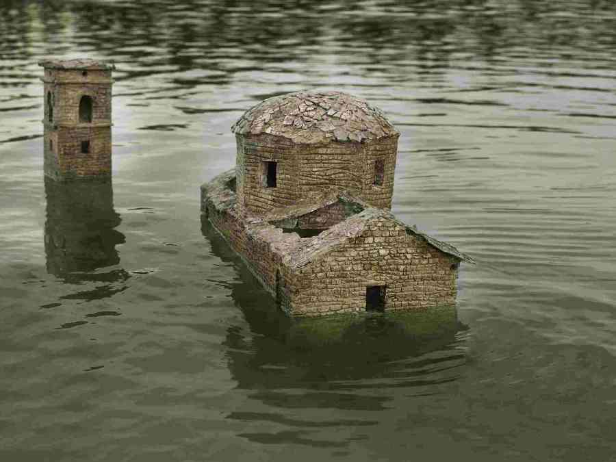 Infine, nell’ultima stanza troviamo il paese di Fabbriche di Careggine. Un paese fantasma della provincia di Lucca, nel comune di Vagli Sotto, abbandonato nel 1947 e quindi sommerso dalle acque del lago artificiale di Vagli formatosi a seguito della costruzione di una diga idroelettrica. Il Lago di Vagli, il più grande bacino idroelettrico della Toscana, è stato svuotato per manutenzione in quattro occasioni, l’ultima, nel 1994. Da allora il paese di Fabbriche di Careggine non ha più visto la luce.