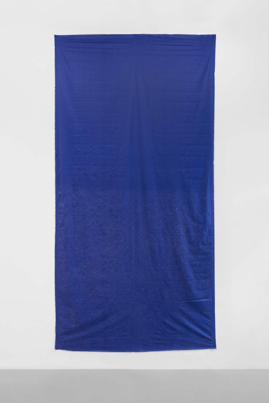 Il lavoro è un “orizzonte” appartenente alla serie di teli dalle diverse tonalità di blu che l’artista in parte immerge nel mare e lascia poi sulla spiaggia, sotto il sole, ad asciugare: il fenomeno fisico della cristallizzazione del sale disegna una trama sulla superficie blu, tracciando così un orizzonte ideale sui tessuti.
