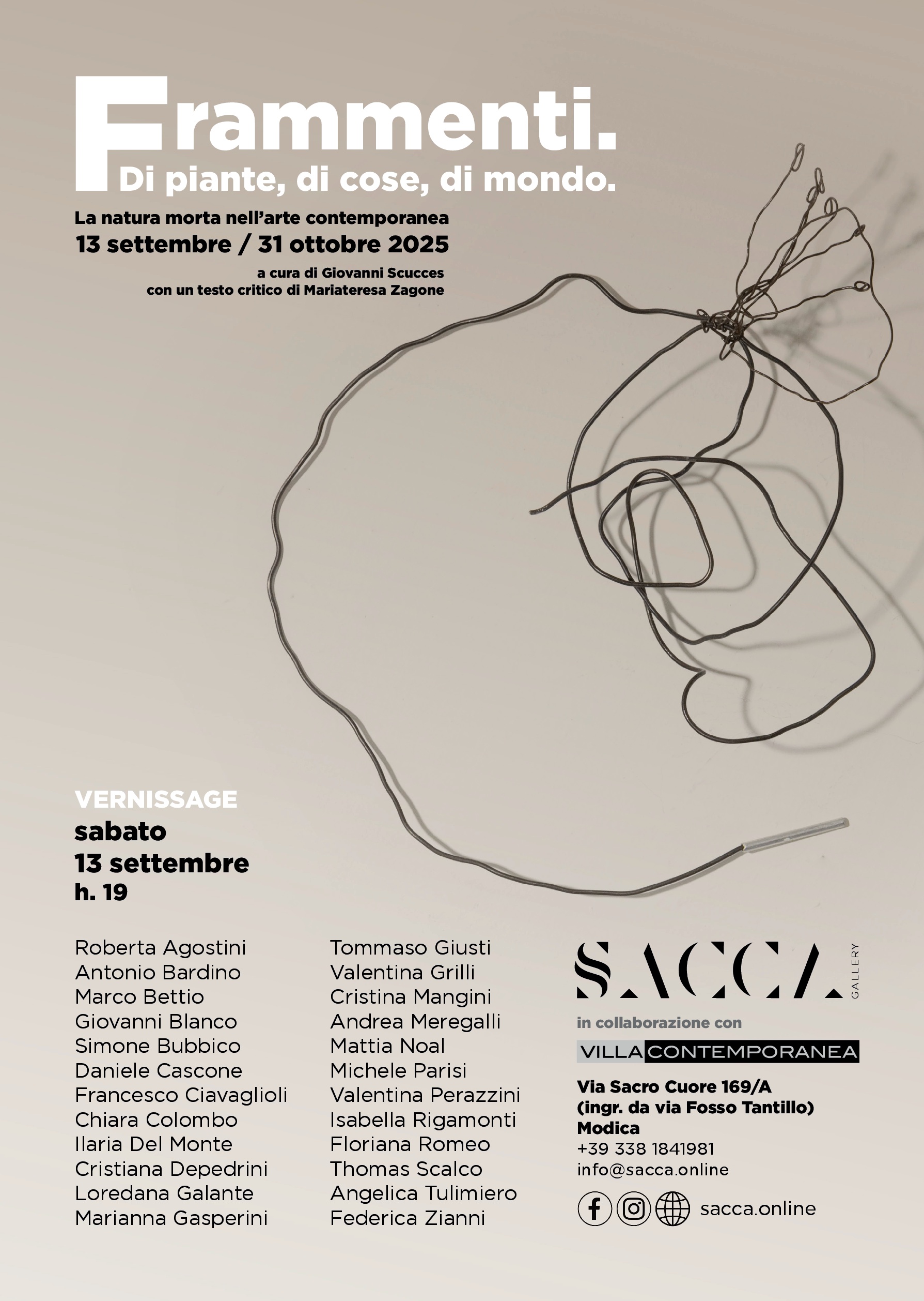 Un dialogo tra due gallerie, due territori (nord e sud) e tre personalità che credono nella forza delle relazioni. In questo modo giunge a Modica la mostra “Frammenti. Di piante, di cose, di mondo” che sarà inaugurata sabato 13 settembre alle ore 19 presso la Galleria SACCA. Curata da Giovanni Scucces, con un testo critico di Mariateresa Zagone e in collaborazione con la Galleria Villa Contemporanea di Monza, vedrà protagonisti 24 artisti fra giovani e mid-career.
