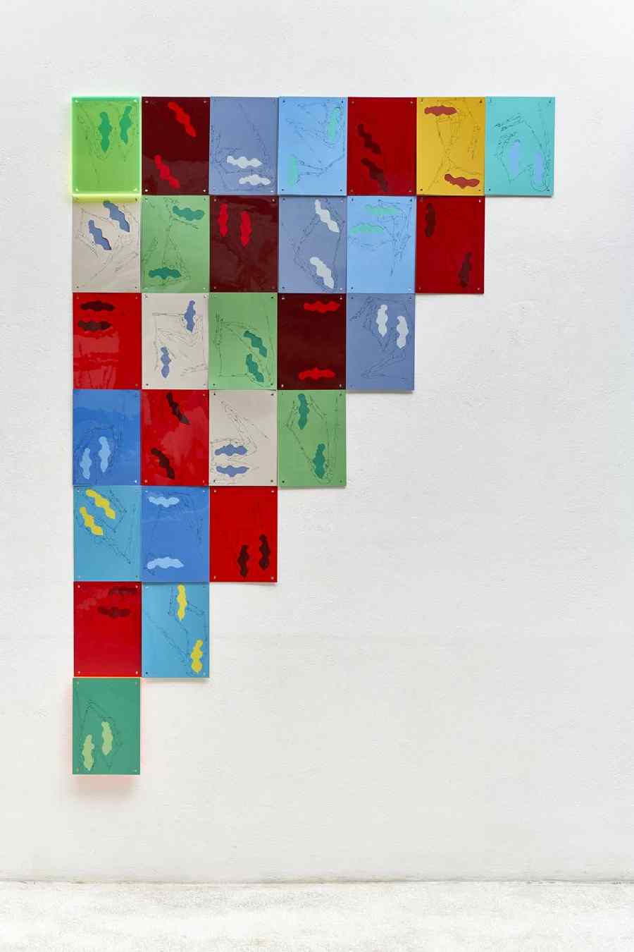 Al piano inferiore vengono presentati dodici “libri” costituiti da fogli colorati riportanti delle fessure le quali possono essere definite come occhi disposti in giochi combinatori. Essi tengono conto delle geometrie dei supporti e delle colorazioni prodotte dai “filtri” di acetato che l’artista vi sovrappone.
