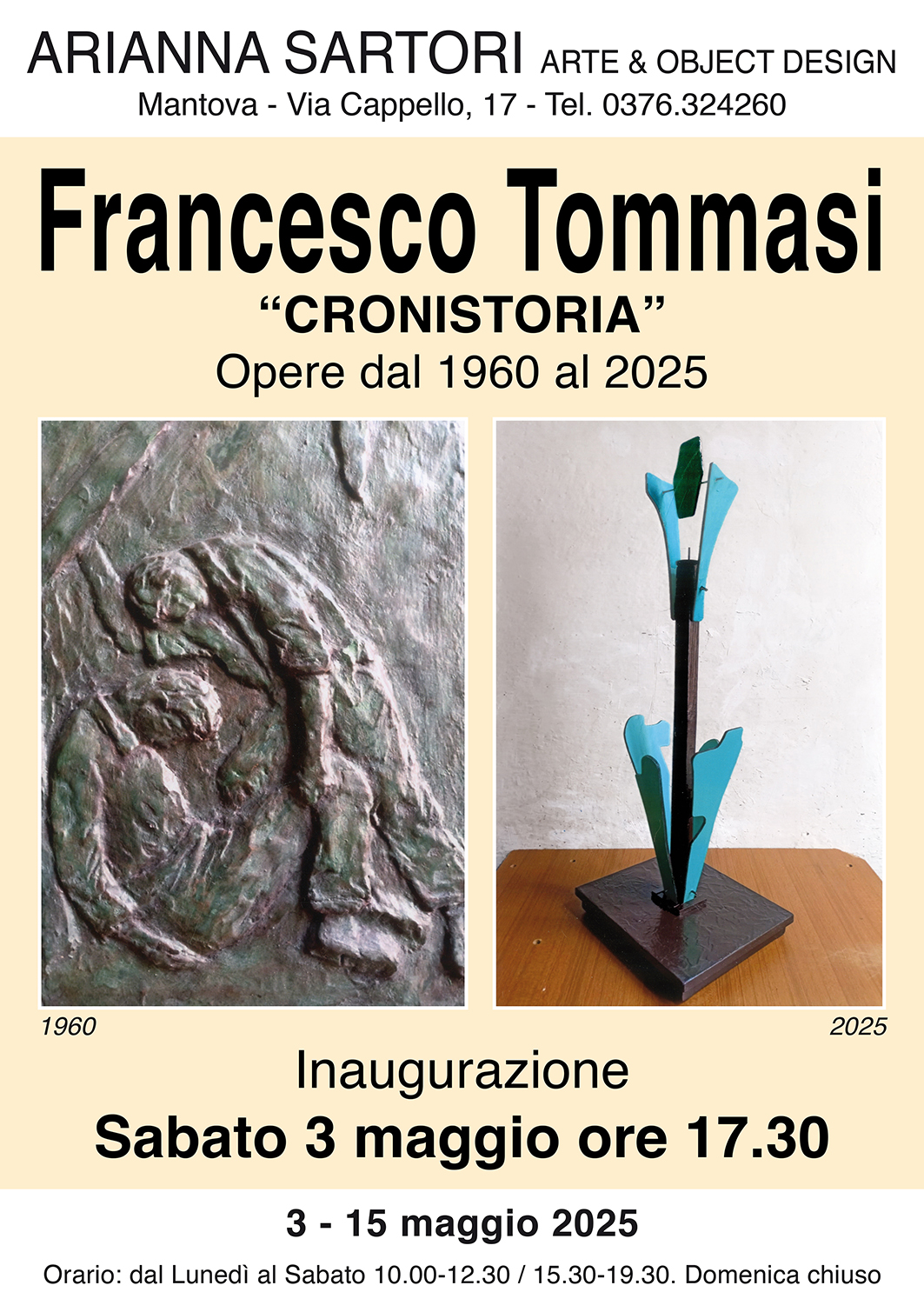 Sabato 3 maggio alle ore 17.30, presso la Galleria d’Arte Arianna Sartori di Mantova in via Cappello 17, si inaugura la mostra personale di Francesco Tommasi dal titolo “CRONISTORIA. Opere dal 1960 al 2025”.