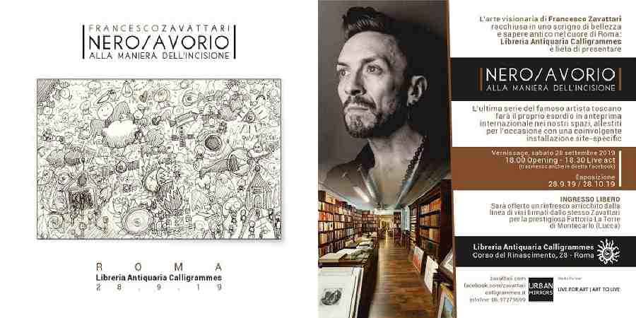 Dopo lo straordinario successo riscosso "in casa" lo scorso agosto in occasione della rassegna culturale Borgo è Bellezza, promossa dal Comune di Borgo a Mozzano, Francesco Zavattari è adesso atteso a Roma per questo mese di Settembre: così come fu per Tavolozze nel 2017, anche in questo caso la capitale vedrà infatti l'esordio di una sua nuova serie, stavolta di tavole inchiostrate, dal titolo NERO/AVORIO. Alla maniera dell'incisione. Il concetto principe alla base di questo nuovo progetto è strettamente connesso al luogo stesso in cui queste opere verranno per la prima volta esposte. Si tratta della splendida Libreria Antiquaria Calligrammes, situata nel pieno centro di Roma, tra Piazza Navona e la chiesa di Sant'Andrea della Valle: ampi ed eleganti locali invasi da preziosi libri e stampe antiche di varie epoche faranno da scenografia naturale all'allestimento concepito dallo staff di Zavattari in diretta collaborazione con la direzione della libreria stessa. L'idea fondante della serie è insita innanzitutto nel titolo, che esprime la dicotomia tra il Nero del tratto e l'Avorio, colore della carta (non dunque bianca) su cui saranno realizzati tutti i disegni. L'artista vuole restituire il senso e il gusto dell'incisione alla "vecchia maniera" senza ovviamente rinunciare allo stile e all'appeal visivo che caratterizza la sua intera produzione: non uno snaturamento, dunque, ma un'evoluzione tecnica, che va a richiamare anche gli altri lavori svolti in passato in tale ambito. Questo percorso vide nel 2014 una delle sue tappe principali con la suite dei disegni presenti nella serie Universo Instabile e trova adesso ulteriore sviluppo grazie sia a tutta l'esperienza coltivata da quel momento a oggi sia a un fondamentale incremento nel concetto e nel significato. Pur nella volontà di non allontanarsi mai dai propri canoni visivi, con queste tavole inchiostrate Zavattari desidera restituire il sapore antico delle incisioni omaggiando in particolare il suo artista preferito, William Blake, e andando così a rafforzare ulteriormente il filo conduttore con il luogo in cui la serie esordisce. Alle ore 18 di sabato 28 Settembre è dunque prevista l'inaugurazione della mostra (visitabile sino al 28.10.19) mentre, alle 18.30, l'artista si esibirà in una delle sue note live performance che, in questo caso, sarà coerente con le peculiarità delle opere realizzate per la serie, costituendo così la summa di questo progetto e della ricerca svolta. Media partner ufficiale dell'iniziativa è Urban Mirrors, magazine di arte contemporanea che già da diversi anni segue con attenzione il lavoro di Zavattari e che, per l'occasione, oltre a occuparsi della regolare copertura mediatica, realizzerà una video intervista negli stessi locali della libreria Calligrammes. Durante l'evento, a ingresso libero e trasmesso anche in diretta live su Facebook, sarà offerto al pubblico un rinfresco, arricchito in particolare dalla linea di vini firmata dallo stesso Zavattari per la prestigiosa Fattoria La Torre di Montecarlo (Lucca).