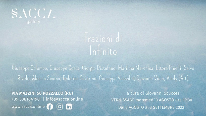 Che aspetto ha l’infinito? Difficile dirlo in maniera univoca. Tuttavia, prova a darne una chiave di lettura la siciliana galleria SACCA nella mostra “Frazioni di Infinito” attraverso gli 11 artisti chiamati ad esporre dal 3 agosto a Pozzallo.