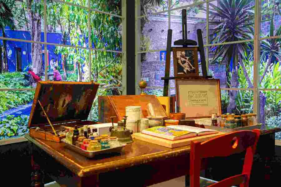Dopo una sezione multimediale con immagini animate e una cronistoria con le date che hanno segnato le vicende della pittrice, la mostra entra nel vivo con la riproduzione minuziosa dei tre ambienti più vissuti da Frida a Casa Azul, la celebre magione messicana costruita in stile francese da Guillermo Kahlo nel 1904: la camera da letto, lo studio realizzato nel 1946 al secondo piano e il giardino.