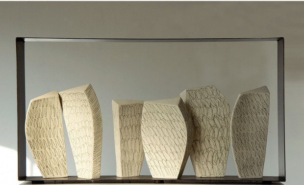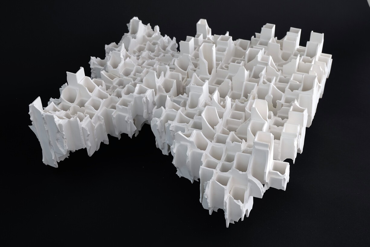 Kouzo Takeuchi, dalla prefettura di Hyogo in Giappone, si interessa ai temi di costruzione e distruzione dando vita a Modern Remains, una serie di opere ispirate dalla rottura accidentale di una ceramica e caratterizzate da complessi motivi geometrici composti da tubi quadrati di porcellana. Una volta completata la cottura e la smaltatura, Takeuchi intacca strategicamente le sculture con un martello. L’effetto di questo processo evoca sia antiche rovine che architetture contemporanee, spingendo lo spettatore a considerare che ciò che esiste ora un giorno sarà in appunto rovina.