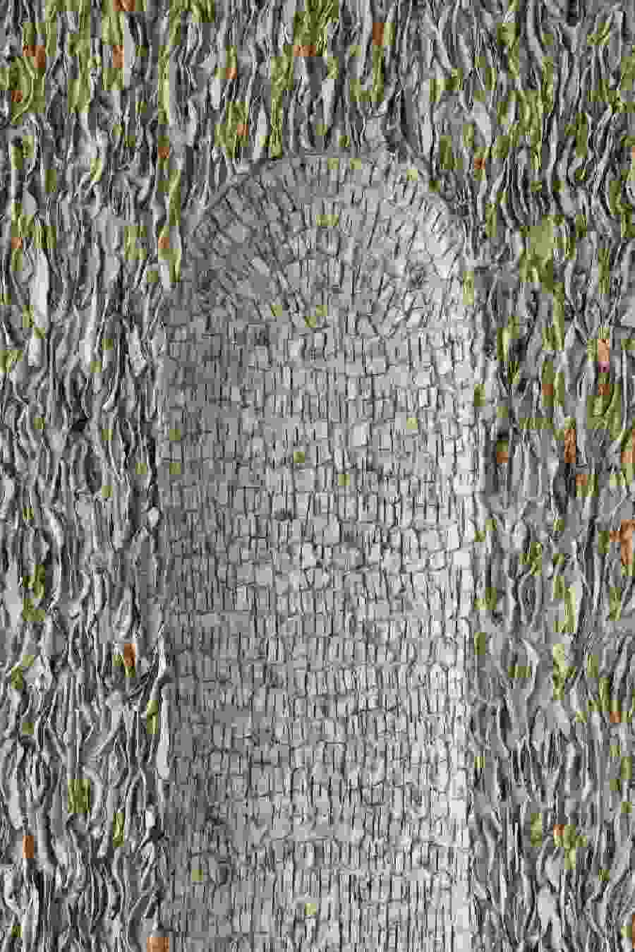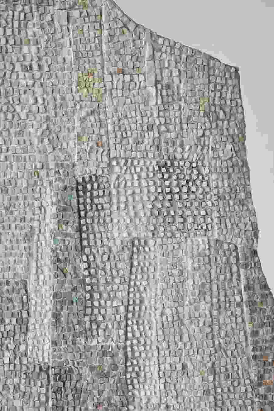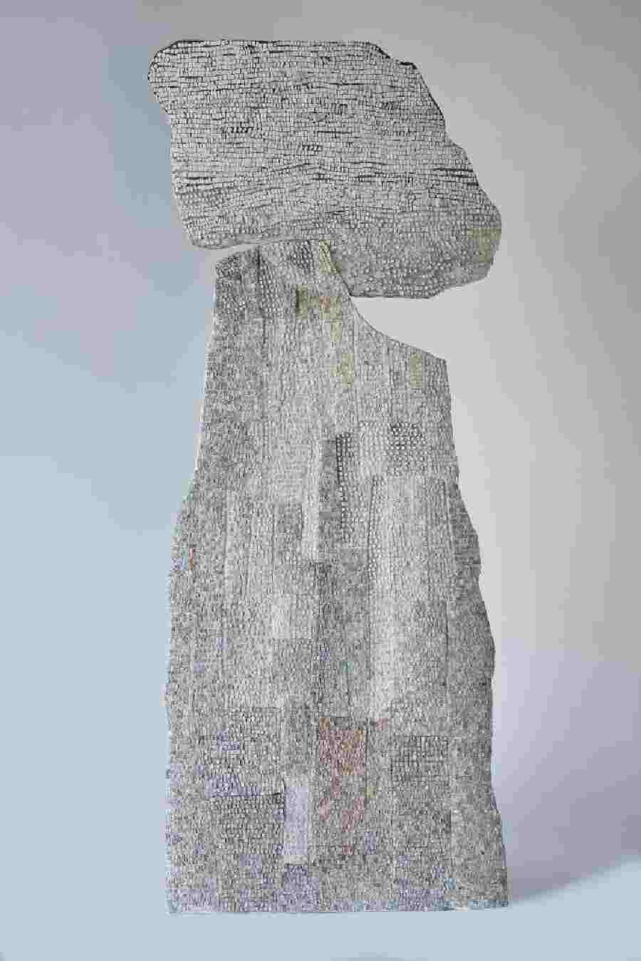 La scultura/mosaico “Il monte e la nuvola”, dove, le forme e il chiarore dei materiali quasi incolore, raccontano la consistenza del monte. La luce e la leggerezza della nuvola, invece, emergono attraverso un gioco di vuoti e pieni, che si esprime, man mano che si sale verso la parte superiore, attraverso il susseguirsi orizzontale dei piccoli multipli di pietrine.