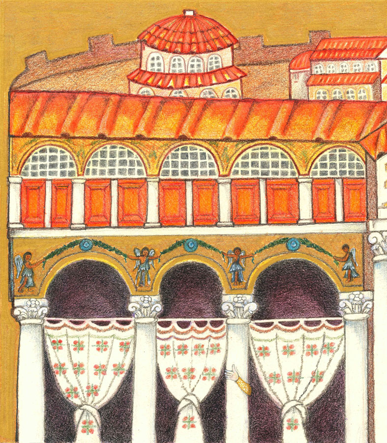 Riconosciuta in tutto il mondo per le sue bellezze artistiche, Ravenna conserva il più ricco patrimonio di mosaici databili tra il V e il VI secolo d.C. custodito all’interno dei suoi edifici religiosi paleocristiani e bizantini, dichiarati dall’Unesco Patrimonio dell’Umanità. Li ritroviamo nei disegni alle pareti, unitamente alla copia di una cartina di Ravenna realizzata a fine Ottocento dal Savini; e poi ancora una illustrazione panoramica che presenta il territorio romagnolo da San Marino ai nove lidi ravennati; quindi la riproduzione di foto storiche della città custodite dalla biblioteca Classense e di scatti delle statue del teatro Alighieri, delle porte di Ravenna, del mausoleo di Teodorico e di palazzo Merlato.