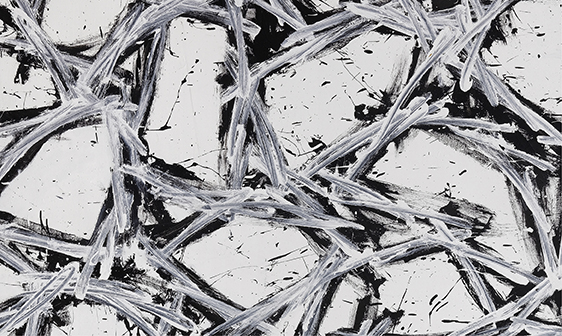 Opere in mostra come Camurro (1981), Diodiavolo (1981), Diodiavolo (1982) rivelano grovigli, contorsioni, capriole, tracce, alle volte forti e penetranti, altre che si assottigliano man mano che si allargano dalla matrice cromatica, rigorosamente nera, che quasi esplode in un lato dell’opera per farsi altro, per liberarsi della propria energia intrinseca. Ecco allora che con il passare degli anni - pensiamo a Aggroblanda del 1984, Bestia del 1985, Zaazze del 1986 e Nemico dello stesso anno, per citare alcune tra le opere in mostra - la traccia di ogni segno si regolarizza in un sistema di coordinate ancor più approfondite, precise, che si allontana dalla gestualità informale per ricomporsi in un sistema in cui il segno si assottiglia per diventare un elemento autonomo, un apparente tubo che si apre per creare spazi di pieno e di vuoto in cui si inserisce il bianco della superficie che diviene “corpo”.