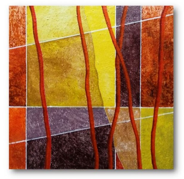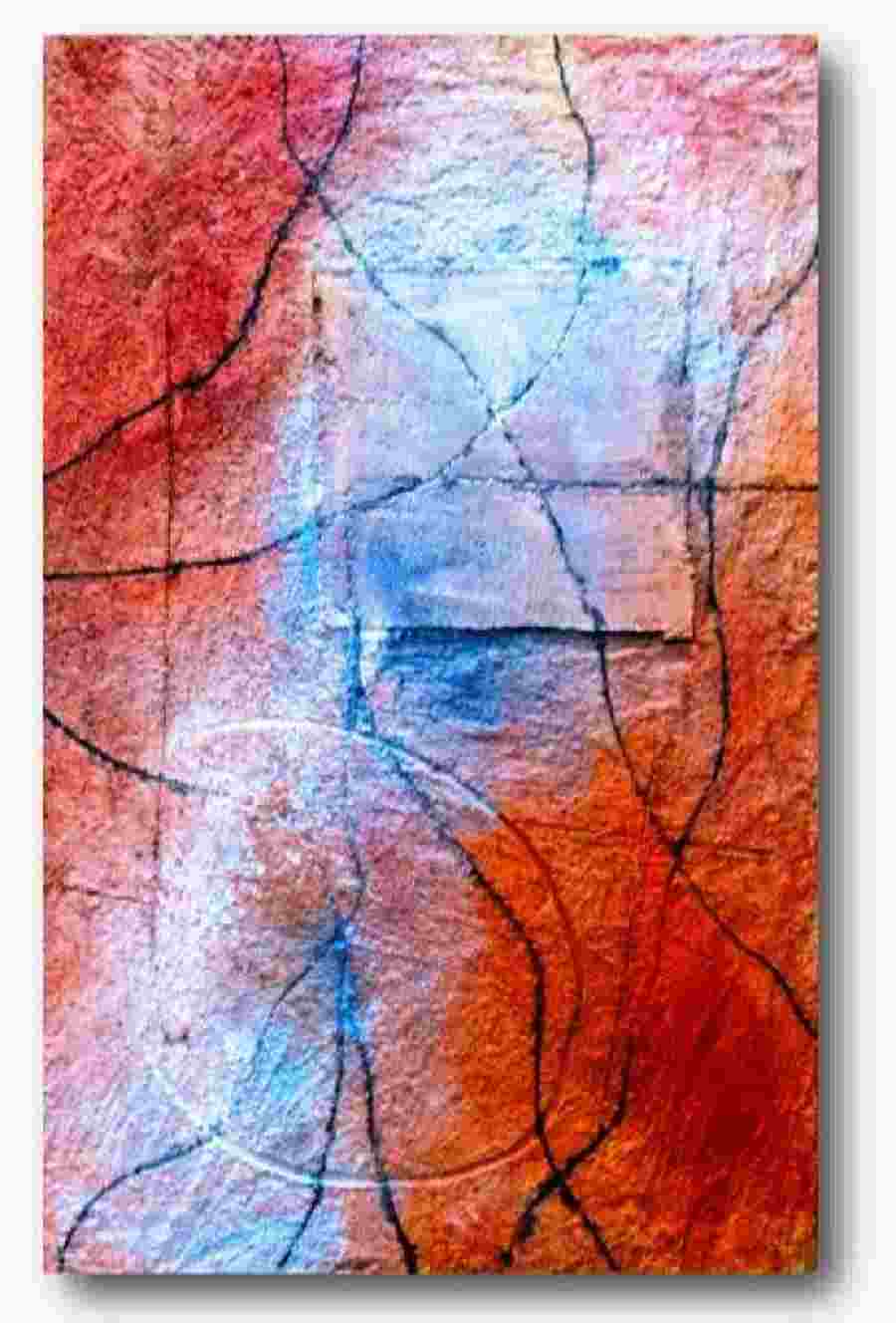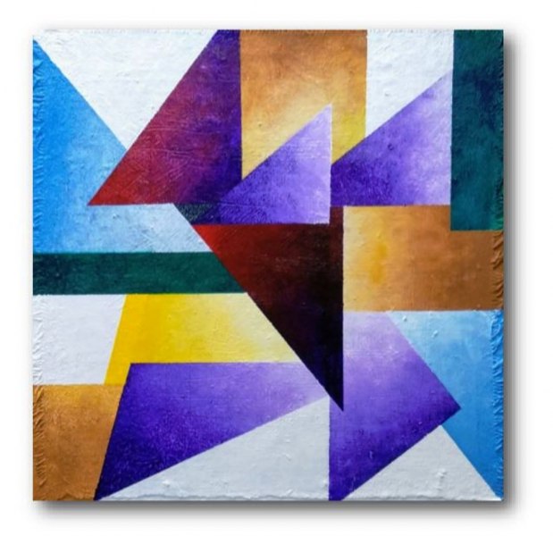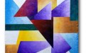 Interessante e coinvolgente, poi, l’ultima produzione dell’artista che, con un ulteriore scatto di fantasia e creatività, ha dilatato le forme e i tracciati, ampliato le visioni e gli spazi creando un Unicum visivo dove Astratto geometrico e Informale sembrano convivere in modo assolutamente naturale ed armonico. Ecco allora che in queste opere la linea e la costruzione geometrica sembrano di colpo interrompersi dando luogo ad una interessante ed imprevedibile metamorfosi segnica che si trasforma in pura riflessione cromatica dove tutto è luce e colore, vibrazione e profondità. In questi casi anche la materia da lui utilizzata diventa morbida e pastosa e sugli sfondi si aprono improvvisi squarci di luce, fluttuanti e morbide pennellate, spontanee ed eleganti cascate cromatiche. In questi casi le sue costruzioni si vestono di leggerezza e delicate trasparenze, si fanno raffinate invenzioni della mente, richiamano assorte e magiche atmosfere.