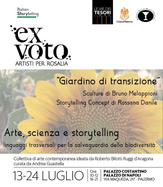 All’interno del progetto Ex voto. Artisti per Rosalia, inaugura il giorno 13 luglio 2022 alle ore 16.00, Giardino di Transizione, storytelling concept con Bruno Melappioni ideato da Rossana Danile, in continuità concettuale con lo spazio Astratte Ri-Generazioni curato da Giusy Emiliano con gli artisti Salvatore Cammilleri, Giacomo Failla, Francesca Lolli, Francesca Neri, Francesca Nesteri, Giuseppe Palermo.
