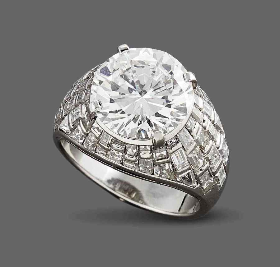 Diamanti e grandi firme sono due tra le atout più richieste da compratori e collezionisti, se coesistono identificano un gioiello di grande importanza e prestigio come l’anello in platino con diamante taglio brillante di ct 6 circondato da pavè di diamanti taglio baguette per ct 5. L’anello a fascia realizzato da Bulgari ha una stima di 70.000/100.000 euro. Il discorso si può replicare per le pietre di colore importanti e di grandi dimensioni: uno zaffiro birmano taglio cuscino di ct 17.90, affiancato da diamanti taglio baguette e taglio brillante, montato su anello in platino firmato Bulgari e offerto a di 45.000/50.000 euro. Molto elegante e di sicura attrattiva sarà anche l’anello in oro bianco con un diamante taglio antico di ct 7.64 stimato 20.000/30.000 euro.