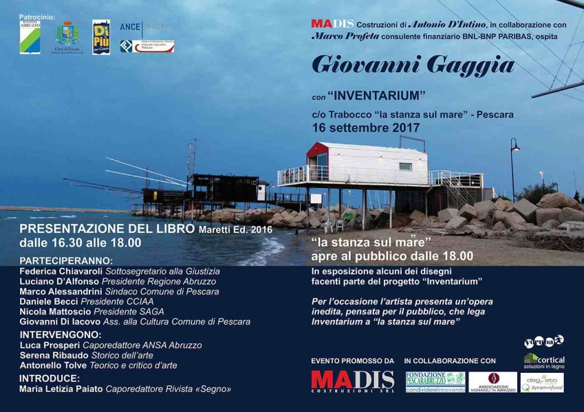 Sabato 16 settembre 2017 a Pescara, nella suggestiva cornice del Trabocco “la stanza sul mare”, la Madis Costruzioni S.r.l. di Antonio D’Intino ospita la presentazione del libro Inventarium di Giovanni Gaggia edito da Maretti Editore, cui si accompagna una selezione di disegni, parte del progetto che da 7 anni l’artista porta avanti sul delicato tema della strage di Ustica.