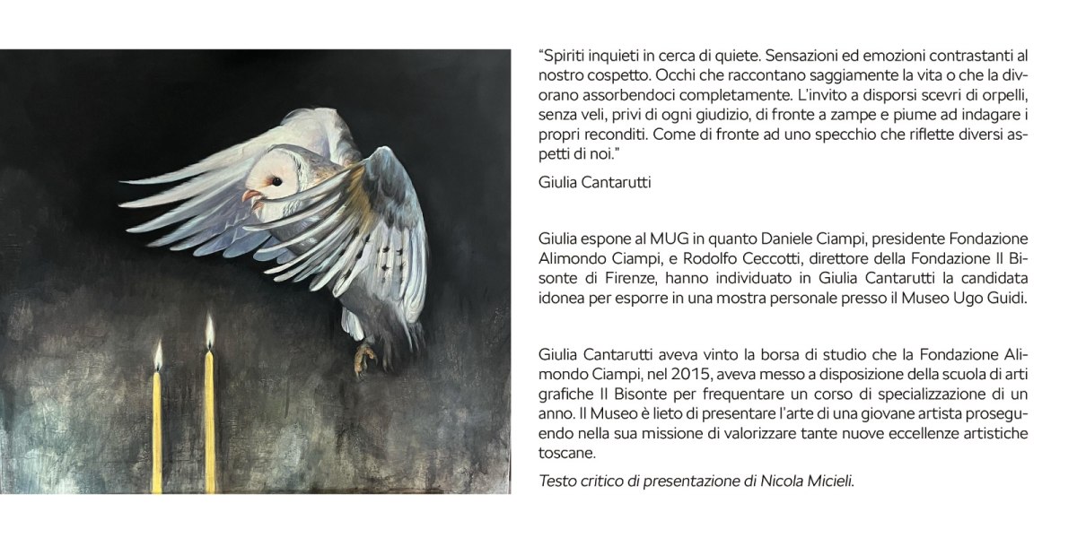 Giulia espone al MUG in quanto Daniele Ciampi, presidente Fondazione Alimondo Ciampi, e Rodolfo Ceccotti, direttore della Fondazione Il Bisonte di Firenze, hanno individuato in Giulia Cantarutti la candidata idonea per esporre in una mostra personale presso il Museo Ugo Guidi.