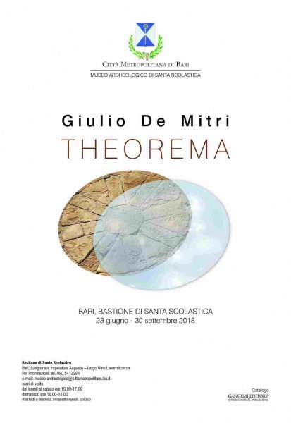 Sabato 23 giugno alle ore 18.30 presso il Bastione aragonese del Museo Archeologico di Santa Scolastica della Città Metropolitana di Bari, sarà inaugurata l'installazione ambientale site specific Theorema di Giulio De Mitri, considerato tra i protagonisti della Light Art e noto a livello nazionale e internazionale.