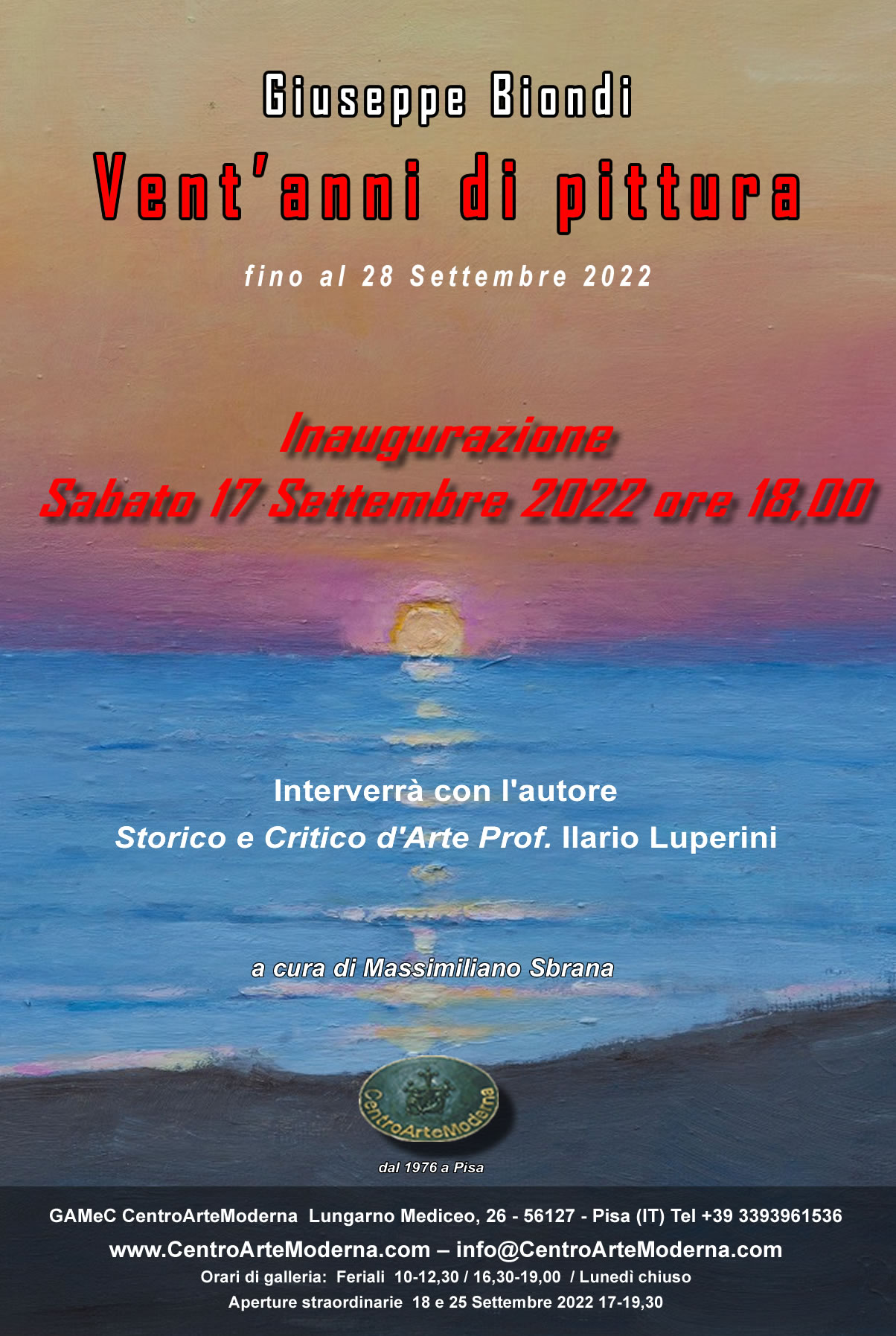Si inaugurerà Sabato 17 Settembre 2022 alle ore 18 presso gli storici spazi espositivi della Galleria d'Arte Moderna e Contemporanea CentroArteModerna di Pisa, a cura di Massimiliano Sbrana (con ingresso libero sul Lungarno Mediceo al n.26), la mostra "Giuseppe Biondi / Vent'anni di Pittura" che vedrà l'intervento del critico e storico del prof. Ilario Luperini.