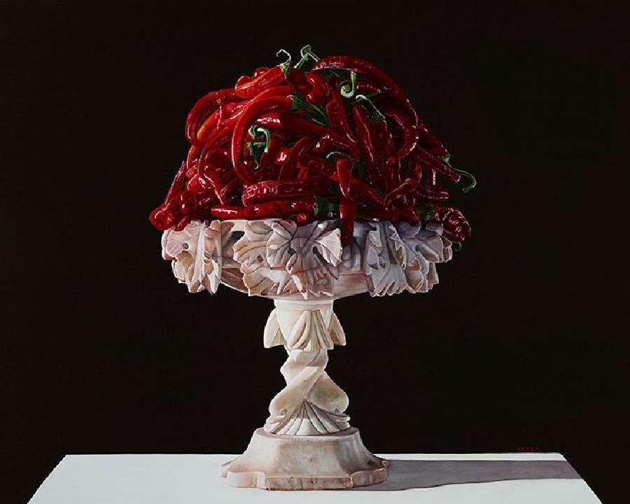 La natura è celebrata attraverso la ricerca di un realismo più perfetto del reale. Come osserva lo chef Pino Cuttaia, padrino d’eccezione dell’iniziativa e autore dell’intervista all’artista presente in catalogo, “i limoni sono rugosi al limite del possibile, i peperoncini lucidi e vivaci, le ciliegie succose ed invitanti”. Ma, proprio perché realistica, la realtà rappresentata nelle opere è imperfetta: “Non sempre i tuoi soggetti sono ritratti nel momento di loro massimo splendore; ho visto ricorrere delle cipolle stanche, non più adatte ad essere consumate ma pronte per essere piantate di nuovo per dare nuovi frutti”, continua Cuttaia dialogando con l’artista.