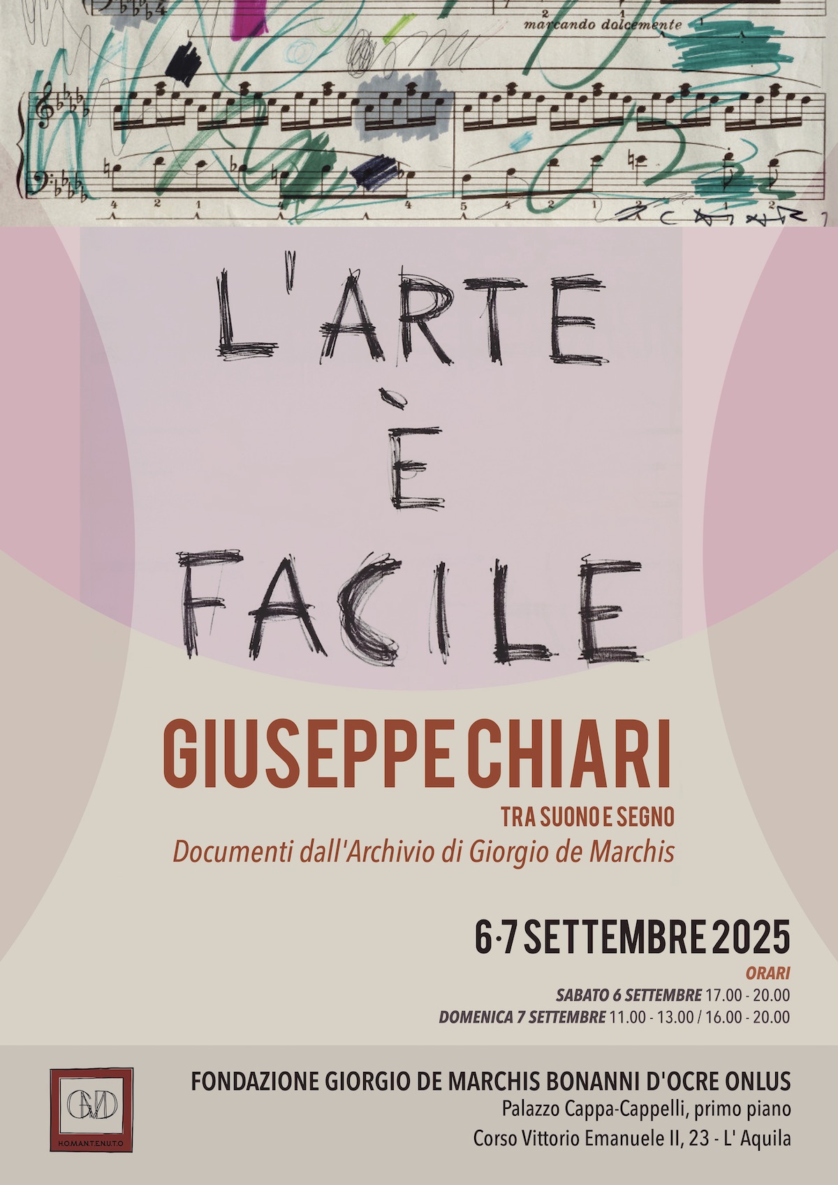 Il pubblico, infatti, potrà accedere al primo piano di Palazzo Cappa Cappelli e partecipare all’iniziativa “Giuseppe Chiari tra suono e segno”, durante la quale saranno a disposizione numerosi documenti che attestano gli scambi culturali tra Giorgio de Marchis e l’artista e compositore Giuseppe Chiari, nonché alcune preziose pubblicazioni sulla ricerca musicale di Chiari.