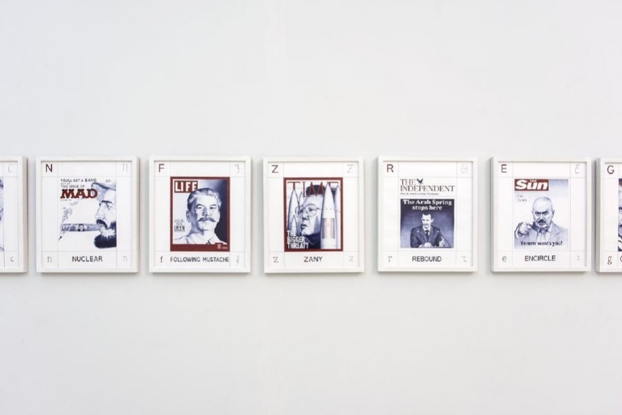 Tra le opere in mostra: l’installazione P-W Peace and War, lunga 13 metri con 114 bandiere corrispondenti ai diversi Paesi vincitori del Premio Nobel che denuncia la logica di potere alla base del più importante riconoscimento internazionale, Premio occidentale per gli occidentali; la tavola Origine du monde, rielaborazione del Ratto d’Europa di Rembrandt, che evidenzia il fallimento della primavera araba e le nuove guerre di religione; venti disegni del ciclo sui Dittatori del XX secolo con immagini prese da copertine di varie riviste internazionali, ridisegnate in un ironico reset contemporaneo; una grande mappa divisa in 12 moduli di 1 metro quadro ciascuno con immagini iconiche da tutti i paesi del mondo; la nuova opera su tavola sempre disegnata a penna BIC Perché il cielo è unico e la terra è tutta spezzettata (da una frase di Rodari) in cui viene riattualizzato, mettendo in evidenza il rapporto tra potere e sovranità, il polittico detto di Donna Brigida del 1492 di Nicolò Alunno conservato nella chiesa di San Nicolò a Foligno. Quest’opera è affiancata da sei cornici, vuote al loro interno, in legno bianco sul bianco dei muri, accompagnate da una targhetta in cui sono indicati autori e dati tecnici dell’opera evocata, come La resurrezione di Piero della Francesca, La zattera della Medusa di Gericault, La libertà guida il popolo di Delacroix, Il Quarto Stato di Pellizza da Volpedo, La rivoluzione siano noi di Beuys e Guernica di Picasso, aggiornamenti di fatti passati con quelli odierni; lo spettatore viene chiamato così ad una precisa responsabilità perché quello spazio vuoto va riempito dalla sua forma mentis che, per vedere l’opera, deve ricostruirla mentalmente riportandola alla fantasia e alla coscienza.