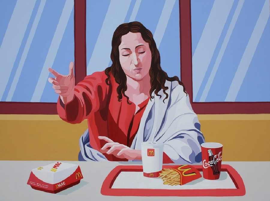 Il titolo della mostra, “Storytelling”, allude ad un’idea di narrazione profondamente connaturata alla ricerca dell’artista. «Le sue storie – spiega il curatore – sono sempre aperte a molteplici interpretazioni. Attraverso l’immediata riconoscibilità di un soggetto che gioca sull’antinomia realtà/finzione, coniugando sacro e profano, figure storiche e personaggi dei cartoon, citazione colta e immaginario consumistico tipico della Pop Art, Veneziano provoca lo spettatore facendo uso di sottile ironia per indurre una seria riflessione sulla società in cui viviamo».